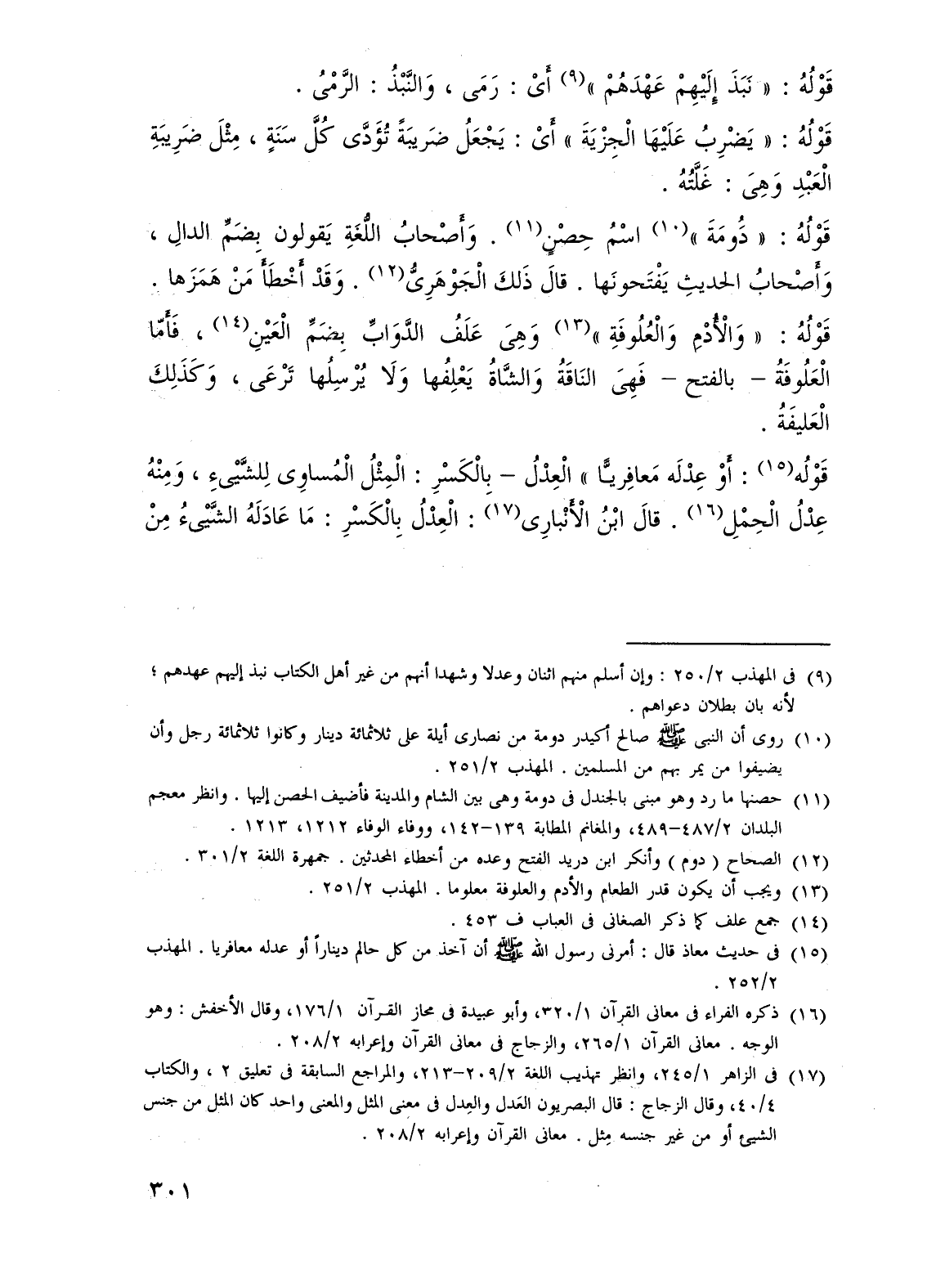 (¬15) في حديث معاذ قال: أمرني رسول الله - صلى الله عليه وسلم - أن آخذ من كل حالم دينارًا أو عدله معافريا. المهذب 2/ 252.