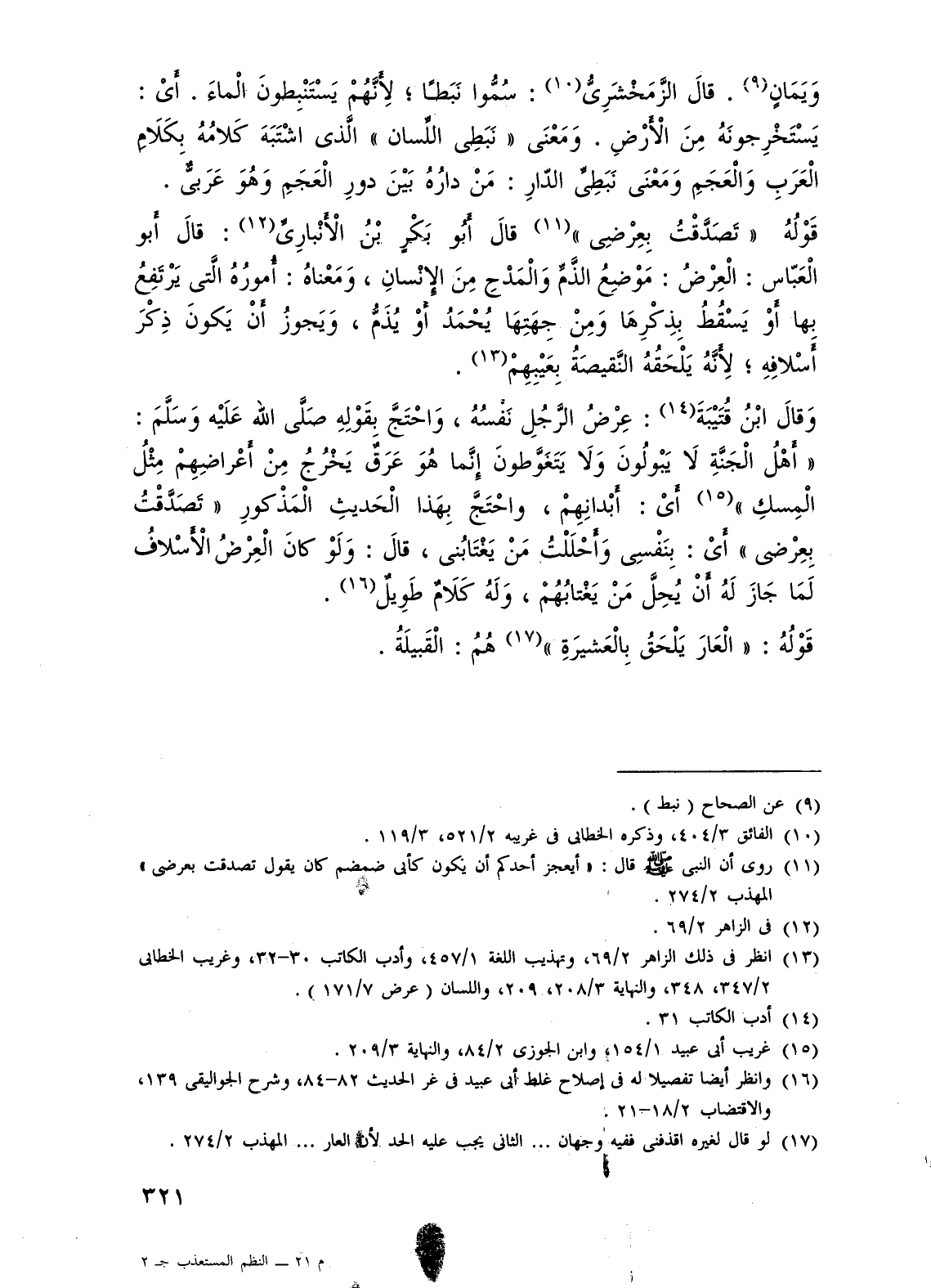 (¬13) انظر في ذلك الزاهر 2/ 69، وتهذيب اللغة 1/ 457، وأدب الكاتب 30 - 32، وغريب الخطابي 2/ 347، 348، والنهاية 3/ 208، 209، واللسان (عرض 7/ 171).