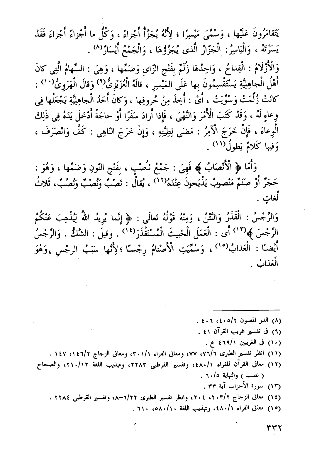وَأَمّا {وَالْأَنْصَابُ} فَهِىَ: جَمْعُ نصْبٍ، بِفَتْحِ النّونِ وَضمِّها، وَهُوَ: حَجَر أَوْ صَنَم مَنْصوبٌ يَذْبَحونَ عِنْدَهُ (¬12)، يُقال: نَصْبٌ وَنُصْب وَنُصبٌ، ثَلاثُ لُغاتٍ.