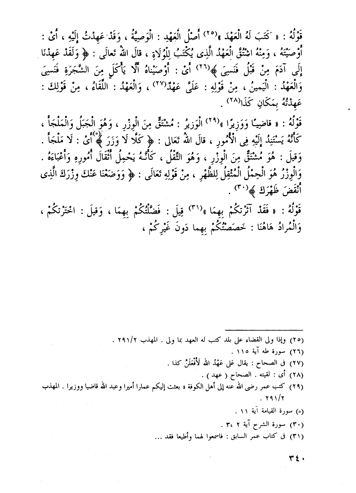 قَوْلُهُ: "كَتَبَ لَهُ الْعَهْدَ" (¬25) أَصْلُ الْعَهْدِ: الْوَصِيَّةُ، وَقَدْ" عَهِدْتُ إِلَيْهِ، أَىْ: أَوْصَيْتَهُ، وَمِنْهُ اشْتُقَّ العَهْدُ الَّذِي يُكْتَبُ لِلوُلَاةِ، قالَ اللهُ تعالَى: {وَلَقَدْ عَهِدْنَا إِلَى آدَمَ مِنْ قَبْلُ فَنَسِيَ} (¬26) أَىْ: أَوْصَيْناهُ أَلَّا يَأْكَل مِنَ الشَّجَرَةِ فَنَسِىَ وَالْعَهْدُ: اليَمينُ، مِن قَوْلِهِ: عَلَىَّ عهدٌ (¬27)، وَالْعَهْدُ: اللِّقَاءُ، مِنْ قَوْلِكَ: عَهِدْتُهُ بِمَكَانِ كَذَا (¬28).