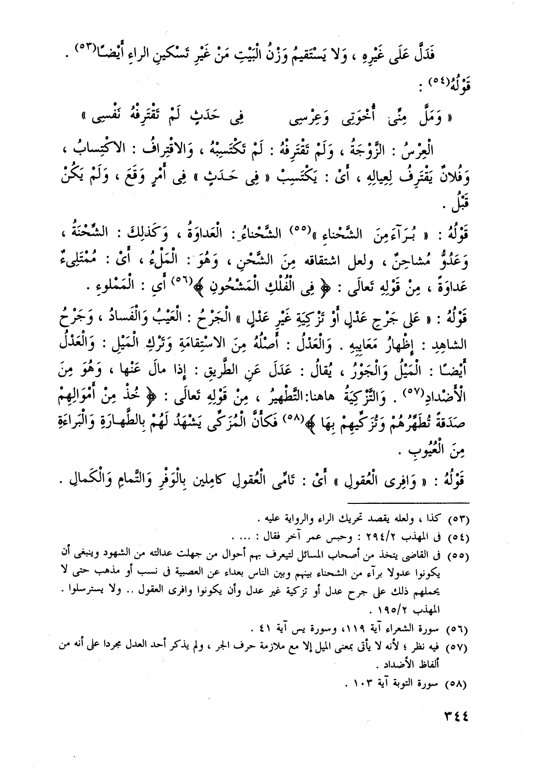 قَوْلُهُ: "عَلى جَرْحِ عَدْلٍ أَوْ تَزْكِيَةِ غَيْرِ عَدْلٍ" الْجَرْحُ. العَيْبُ وَالْفَسادُ، وَجَرْحُ الشَّاهِدِ: إِظْهارُ مَعَايِبِهِ. وَالْعَدْلُ: أَصْلُهُ مِن الاسْتِقامَةِ وَترْكِ الْمَيْلِ: وَالعَدلُ أَيْضًا: الْمَيْلُ وَالْجَوْرُ، يُقالُ: عَدَلَ عَنِ الطَّريق: إِذا مالَ عَنْها، وَهوَ مِن الْأَضْدادِ (¬57). وَالتَّزْكِيَةُ ها هنا: التَّطْهيرُ، مِنْ قَوْلِهِ تعالَى: {خُذْ مِنْ أَمْوَالِهِمْ صَدَقَةً تُطَهِّرُهُمْ وَتُزَكِّيهِمْ بِهَا} (¬58) فَكأنَّ الْمُزَكِّى يَشْهَدُ لَهُمْ بِالطَّهارَةِ وَالْبَراءَةِ مِنَ الْعُيُوبِ.