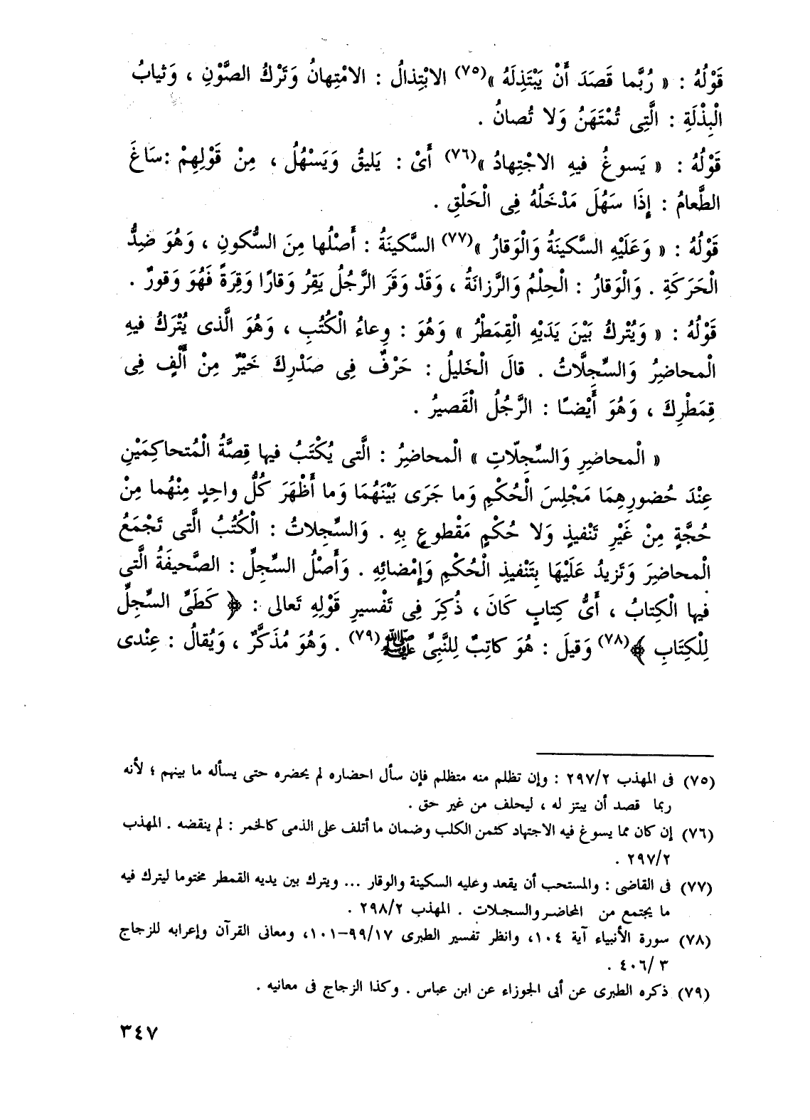 (¬77) في القاضى: والمستحب أن يقعد وعليه السكينة والوقار. . . ويترك بين يديه القمطر مختوما ليترك فيه ما يجتمع من المحاضر والسجلات. المهذب 2/ 298.
