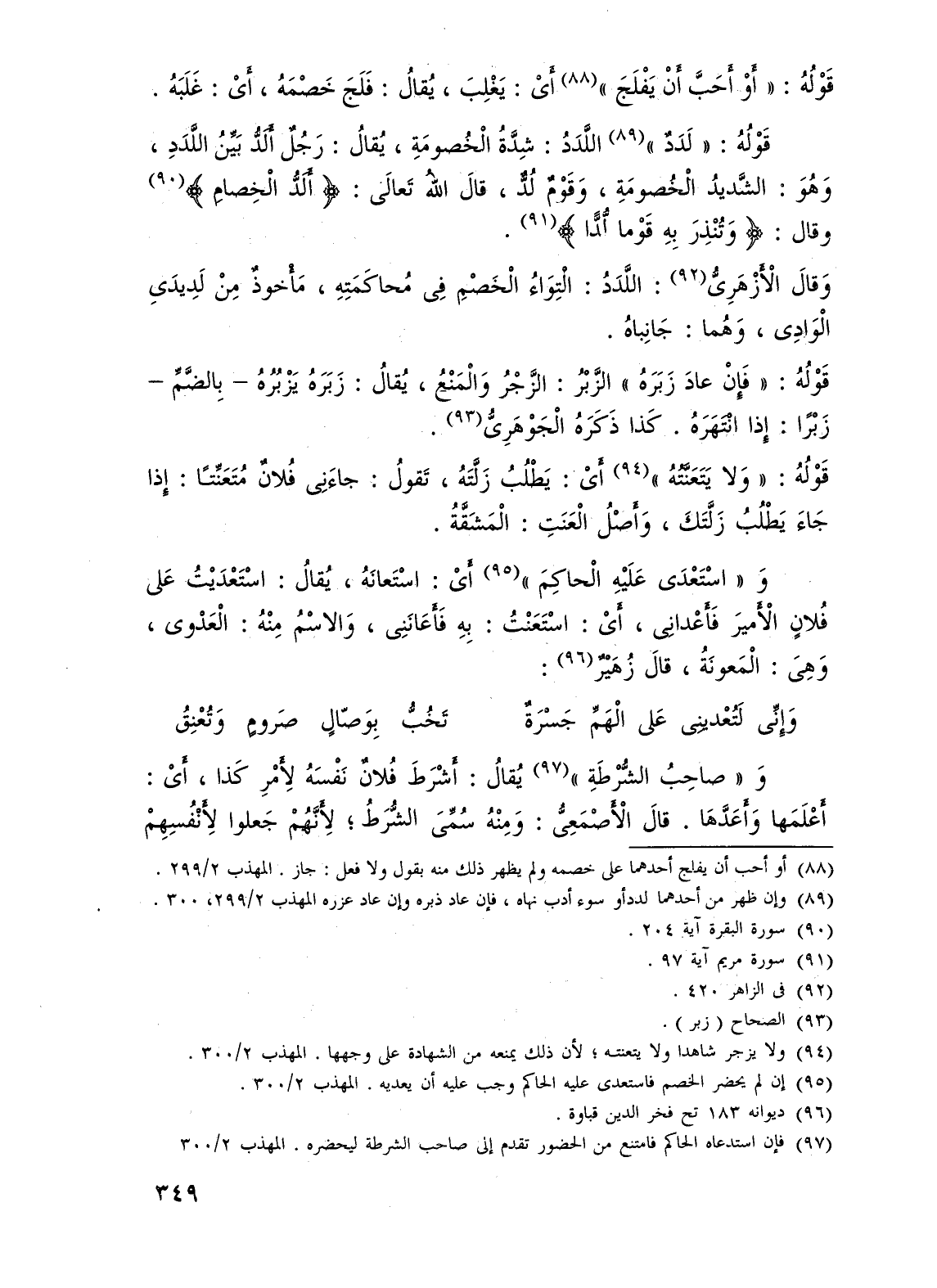 وَقالَ الْأَزْهَرِىُّ (¬92): اللَّدَدُ: الْتِوَاءُ الْخَصْمِ فِى مُحاكَمَتِهِ، مَأْخوذٌ مِنْ لَدِيدَىِ الْوَادِى، وَهُما: جَانِباهُ.