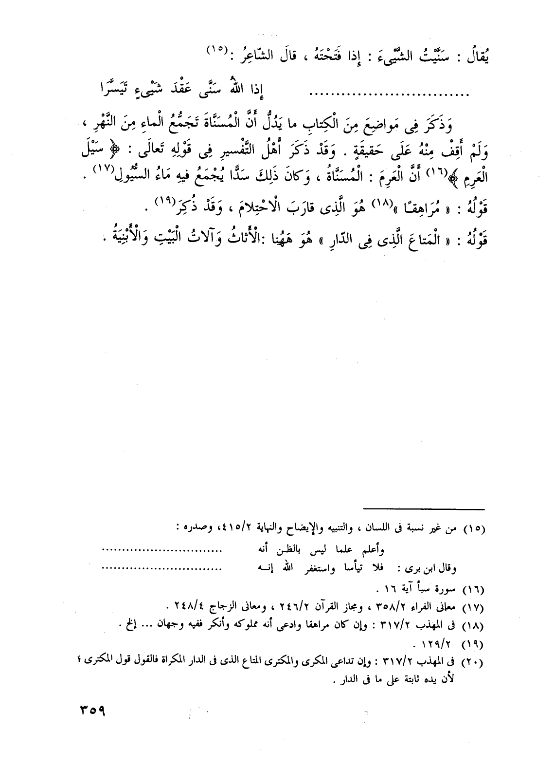 وَذَكر فِى مَواضِعَ مِنَ الْكِتابِ ما يَدُلُّ أَنَّ الْمُسَنَّاةَ تَجَمُّعُ الْماءِ مِنَ النَّهْرِ، وَلَمْ أَقِفْ مِنْهُ عَلَى حَقيقَةٍ. وَقَد ذَكَرَ أَهْلُ التَّفْسيرِ فِى قَوْلِهِ تَعالَى: {سَيْلَ الْعَرِمِ} (¬16) أَنَّ الْعَرِمَ: الْمُسَنَّاة، وَكانَ ذَلِكَ سَدًّا يُجْمَعُ فيهِ مَاءُ السُّيُولِ (¬17).