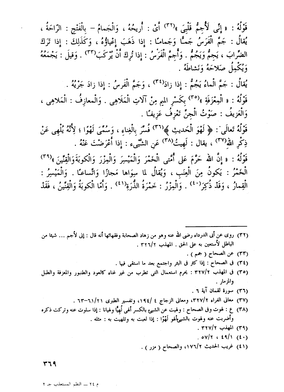 قَوْلُهُ تَعالَى: {لَهْوَ الْحَدِيثِ} (¬36) فُسِّر بِالْغِناءِ، وَسُمِّىَ لَهوا؛ لِأنَّهُ يُلْهِى عَنْ ذِكرِ اللهِ (¬37)، يقال: لَهِيتُ (¬38) عَنِ الشَّيْىء: إِذا اعرَضْتَ عَنْهُ.