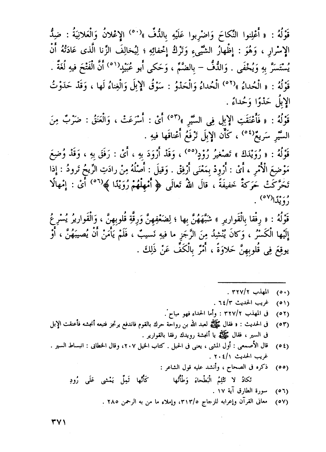 (¬53) في الحديث: "فقال - صلى الله عليه وسلم - لعبد الله بن رواحة حرك بالقوم فاندفع يرتجز فتبعه أنجشه فأعنقت الإبل في السير، فقال - صلى الله عليه وسلم - يا أنجشة رويدك رفقا بالقوارير.