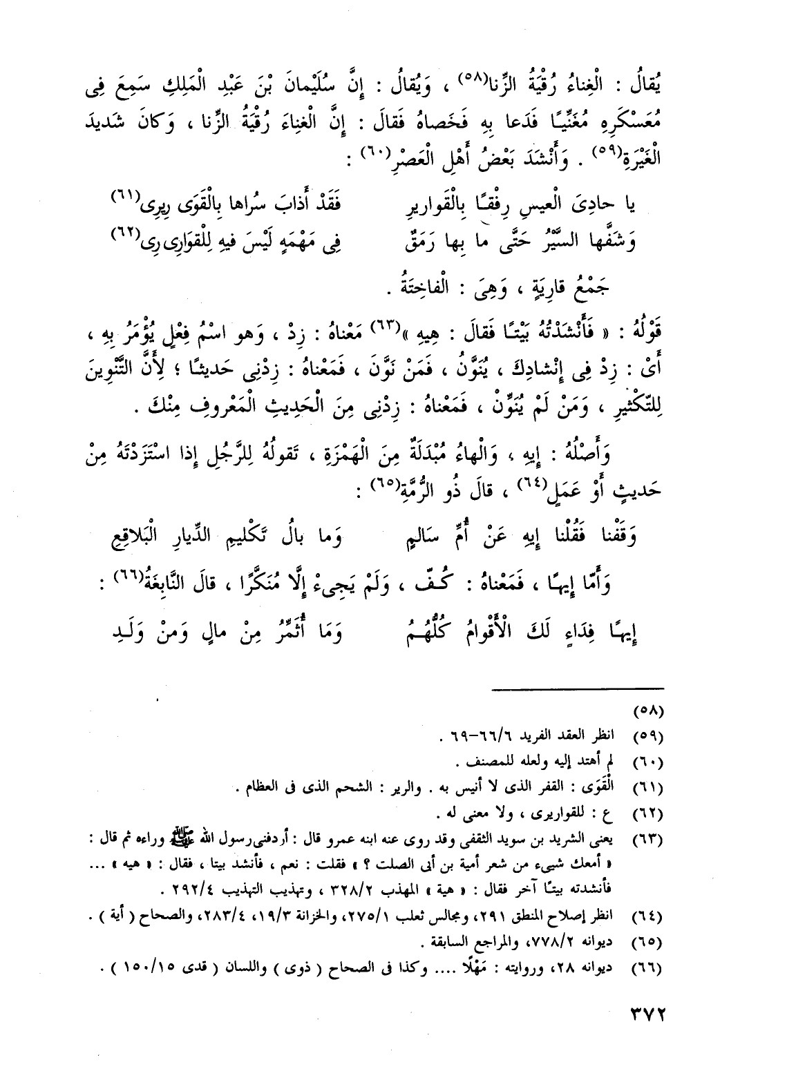 يُقالُ: الْغِناءُ رُقْيَةُ الزِّنا (¬58)، وَيُقالُ: إِنَّ سُلَيْمانَ بْنَ عَبْد الْمَلِكِ سَمِعَ فِى مُعَسْكَرِهِ مُغَنِّيًا فَدَعا بِهِ فَخَصاهُ فَقالَ: إِنَّ الْغنِاءَ رُقْيَةُ الزنا، وَكانَ شَديدَ الْغَيْرَةِ (¬59). وَأَنْشَدَ بَعْض أَهْلِ الْعَصْرِ (¬60):
