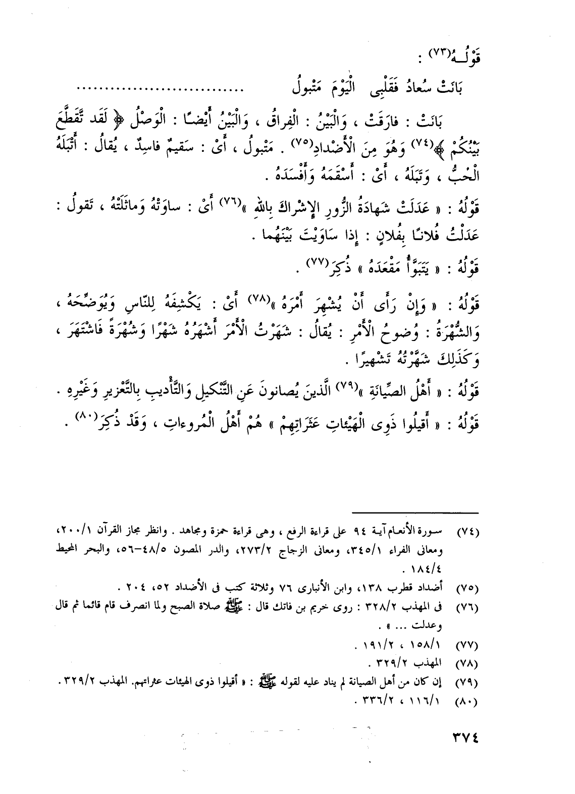 بَانَتْ: فارَقَتْ، وَالْبَيْنُ: الْفِراقُ، وَالْبَيْنُ أَيْضًا: الْوَصْلُ {لَقَدْ تَقَطَّعَ بَيْنَكُمْ} (¬74) وَهُوَ مِنَ الْأَضْدادِ (¬75). مَتْبولُ، أَيْ: سَقيمٌ فاسِدٌ، يُقالُ: أَتْبَلَهُ الْحبُّ، وَتَبَلَهُ، أَيْ: أَسْقَمَهُ وَأَفْسَدَهُ.