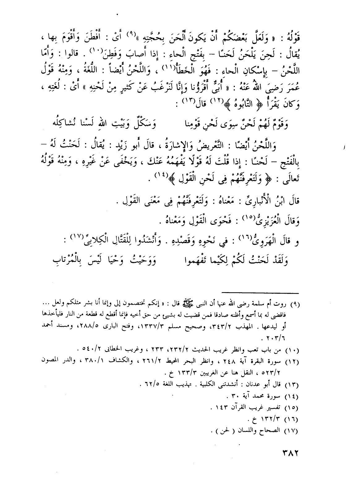 قَوْلُهُ: "وَلَعَلَّ بَعْضَكُمْ أَن يَكونَ أَلْحَنَ بِحُجَتِهِ" (¬9) أَىْ: أَفْطنَ وَأَقْوَمَ بِها، يُقالُ: لَحِنَ يَلْحَنُ لَحَنًا- بِفَتْحِ الْحاءِ: إِذا أَصابَ وَفَطِنَ (¬10). قالوا: وَأَمّا اللَّحْنُ- بِإِسْكانِ الْحاءِ: فَهُوَ الْخَطَأْ (¬11)، وَاللَّحْنُ أَيْضًا: اللُّغَةُ، وَمِنْهُ قَوْلُ عُمَرَ رَضِىَ الله عَنْهُ: "أُبَىٌّ أَقرَؤُنا وَإِنَّا لَنَرْغَبُ عَنْ كَثيرٍ مِنْ لَحْنِهِ" أَيْ: لُغَتِهِ، وَكانَ يَقْرَأُ {التَّابُوهُ} (¬12) قالَ (¬13):