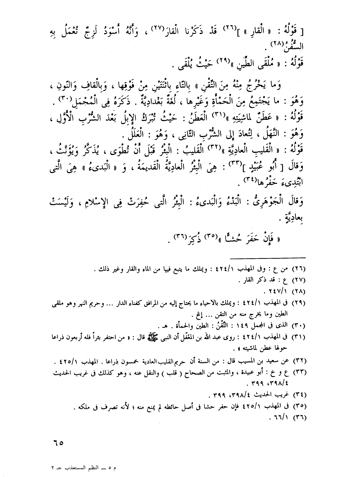 (¬31) فى المهذب 1/ 424: روى عبد الله بن المغَفّل أن النبى - صلى الله عليه وسلم - قال: "من احتفر بئرًا فله أربعون ذراعا حولها عطن لماشيته".