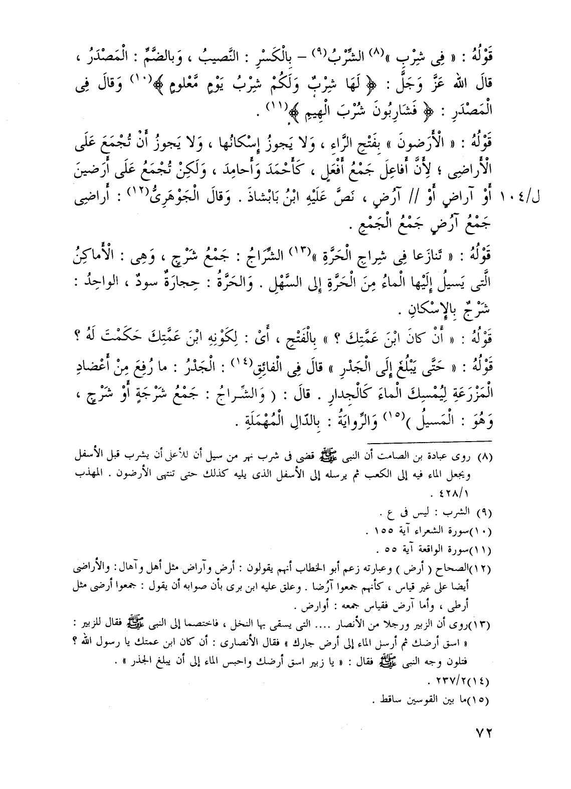 (¬13) روى أن الزبير ورجلا من الأنصار. . . . التى يسقى بها النخل، فاختصما إلى النبى - صلى الله عليه وسلم - فقال للزبير: "اسق أرضك ثم أرسل الماء إلى أرض جارك" فقال الأنصارى: أن كان ابن عمتك يا رسول الله؟ فتلون وجه النبى - صلى الله عليه وسلم - فقال: "يا زبير اسق أرضك واحبس الماء إلى أن يبلغ الجذر".