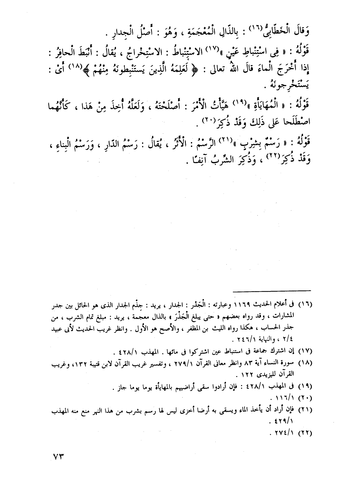 (¬16) فى أعلام الحديث 1169 وعبارته: الْجَدْر: الجدار، يريد: جِذْم الجدار الذى هو الحائل بين جدر المشارات، وقد رواه بعضهم "حتى يبلغ الْجَذْرَ" بالذال معجمة، يريد: مبلغ تمام الشرب، من جذر الحساب، هكذا رواه الليث بن المظفر، والأصح هو الأول. وانظر غريب الحديث لأبى عبيد 2/ 4، والنهاية 1/ 246.