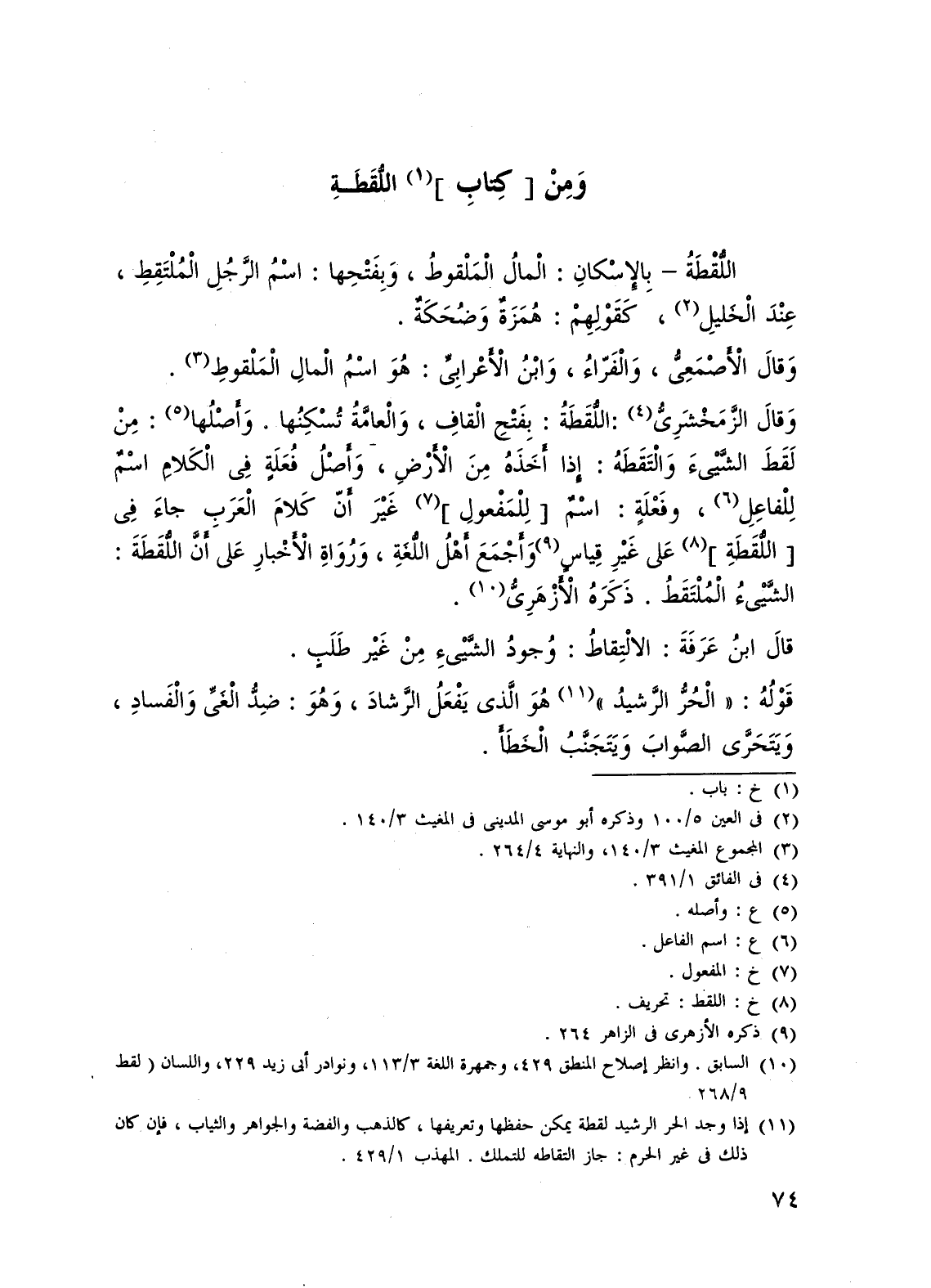 وَقالَ الزَّمَخْشَرِىُّ (¬4): اللُّقَطَةُ: بِفَتْحِ الْقافِ، وَالْعامَّةُ تُسْكِنُها. وَأَصْلُها (¬5): مِنْ لَقَطَ الشَّيْىءَ وَالْتَقَطَهُ: إِذا أَخَذَهُ مِنَ الْأَرْضِ، وَأَصْلُ فُعَلَةٍ فِى الْكَلامِ اسْمٌ لِلْفاعِلِ (¬6)، وفَعْلَةٍ: اسْمٌ [لِلْمَفْعولِ] (¬7) غَيْرَ أَنّ كَلامَ الْعَرَبِ جاءَ فِى [اللُّقَطَةِ] (¬8) عَلى غَيْرِ قِياس (¬9) وَأَجْمَعَ أَهْلُ اللُّغَةِ، وَرُوَاةِ الْأَخْبارِ عَلى أَنَّ اللُّقَطَةَ: الشَّيْىءُ الْمُلْتَقَطُ. ذَكَرَهُ الْأزْهَرِىُّ (¬10).