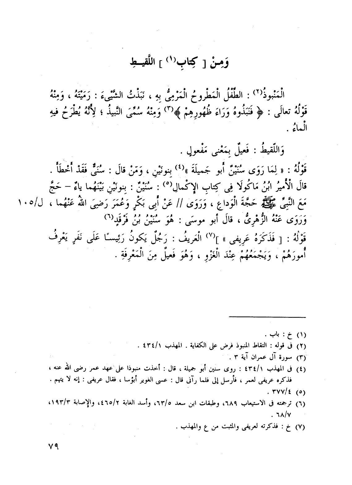 (¬4) فى المهذب 1/ 434: روى سنين أبو جميلة، قال: أخذت منبوذا على عهد عمر - رضي الله عنه -، فذكره عريفى لعمر، فأرسل إلى فلما رآنى قال: عسى الغوير أبؤسا، فقال عريفى: إنه لا يتهم.