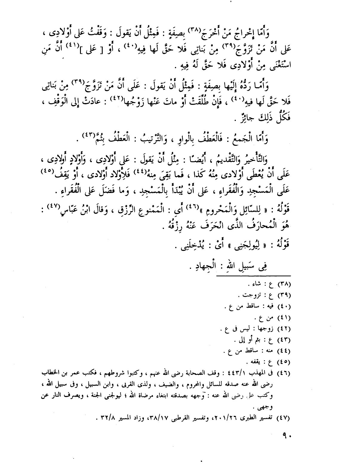 (¬46) فى المهذب 1/ 443: وقف الصحابة رضي الله عنهم، وكتبوا شروطهم، فكتب عمر بن الخطاب - رضي الله عنه - صدقه للسائل والمحروم، والضيف، ولذى القربى، وابن السبيل، وفى سبيل الله، وكتب على - رضي الله عنه -: وجهه بصدقته ابتغاء مرضاة الله، ليولجنى الجنة، ويصرف النار عن وجهى.