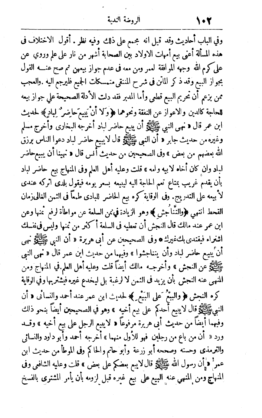 وفي الباب أحاديث وقد قيل: إنه مجمع على ذلك وفيه نظر. أقول: الاختلاف في هذه المسألة أعني بيع أمهات الأولاد بين الصحابة أشهر من نار على علم وروي عن علي كرم الله وجهه الموافقة لعمر ومن معه في عدم جواز بيعهن ثم صح عنه القول بجواز البيع وقد ذكر الماتن في شرح المنتقى متمسكات الجميع فليرجع إليه والعجب ممن يزعم أن تحريم البيع قطعي وأما المدبر فقد دلت الأدلة الصحيحة على جواز بيعه للحاجة كالدَّين والإعواز عن النفقة ونحوهما "ولا أن يبيع حاصر لباد"لحديث ابن عمر قال: "نهى النبي صلى الله عليه وسلم أن يبيع حاضر لباد "أخرجه البخاري وأخرج مسلم وغيره من حديث جابر "أن النبي صلى الله عليه وسلم قال: لا يبيع حاضر لباد دعوا الناس يرزق الله بعضهم من بعض" وفي الصحيحين من حديث أنس قال: "نهينا أن يبيع حاضر لباد وإن كان أخاه لأبيه وأمه "قلت: وعليه أهل العلم وفي المنهاج بيع حاضر لباد بأن يقدم غريب بمتاع تعم الحاجة إليه الحاجة إليه ليبيعه بسعر يومه فيقول بلديّ اتركه عندي لأبيعه على التدريج وفي الوقاية: كره بيع الحاضر للبادي طمعا في الثمن الغالي زمان القحط انتهى "والتناجش"وهو الزيادة في ثمن السلعة عن مواطأة لرفع ثمنها وعن ابن عمر عند مالك قال: النجش أن تعطيه في السلعة أكثر من ثمنها وليس في نفسك اشتراء فيقتدي بك غيرك وفي الصحيحين عن أبي هريرة "أن النبي صلى الله عليه وسلم نهى أن يبيع حاضر لباد وأن يتناجشوا" وفيهما من حديث ابن عمر قال: "نهى النبي صلى الله عليه وسلم عن النجش" وأخرجه مالك أيضا قلت: وعليه أهل العلم في المنهاج ومن المنهي عنه النجش بأن يزيد في الثمن لا لرغبة بل ليخدع غيره فيشتريها وفي الوقاية كره النجش "والبيع على البيع"لحديث ابن عمر عند أحمد والنسائي "أن النبي صلى الله عليه وسلم قال: لا يبيع أحدكم على بيع أخيه" وهو في الصحيحين أيضا بنحو ذلك وفيهما أيضا من حديث أبي هريرة مرفوعا "لا يبيع الرجل على بيع أخيه " وقد ورد " أن من باع من رجلين فهو للأول منهما" أخرجه أحمد وأبو داود والنسائي والترمذي وحسنه وصححه أبو زرعة وأبو حاتم والحاكم وفي الموطإ من حديث ابن عمر "أن رسول الله صلى الله عليه وسلم قال: لا يبع بعضكم على بعض " قلت: وعليه الشافعي وفي المنهاج ومن المنهي عنه البيع على بيع غيره قبل لزومه بأن يأمر المشتري بالفسخ