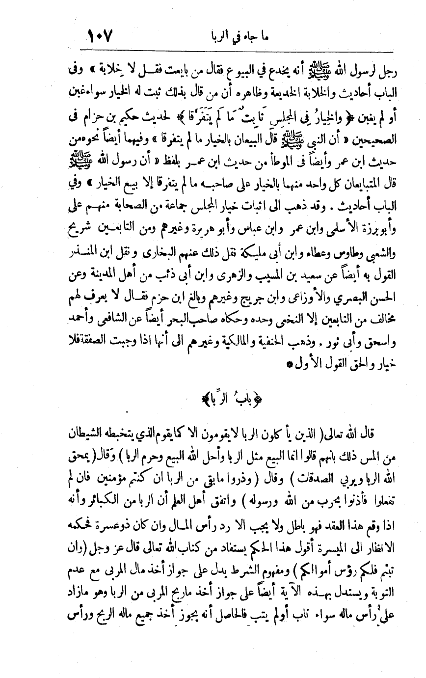 قال الله تعالى: {الَّذِينَ يَأْكُلُونَ الرِّبا لا يَقُومُونَ إِلَّا كَمَا يَقُومُ الَّذِي يَتَخَبَّطُهُ الشَّيْطَانُ مِنَ الْمَسِّ ذَلِكَ بِأَنَّهُمْ قَالُوا إِنَّمَا الْبَيْعُ مِثْلُ الرِّبا} وقال: {يَمْحَقُ اللَّهُ الرِّبا وَيُرْبِي الصَّدَقَاتِ} وقال: {يَا أَيُّهَا الَّذِينَ آمَنُوا اتَّقُوا اللَّهَ وَذَرُوا مَا بَقِيَ مِنَ الرِّبا إِنْ كُنْتُمْ مُؤْمِنِينَ فَإِنْ لَمْ تَفْعَلُوا فَأْذَنُوا بِحَرْبٍ مِنَ اللَّهِ وَرَسُولِه} واتفق أهل العلم أن الربا من الكبائر وأنه إذا وقع هذا العقد فهو باطل ولا يجب إلا رد رأس المال وإن كان ذو عسرة فحكمه الإنظار إلى الميسرة أقول: هذا الحكم يستفاد من كتاب الله تعالى قال عز وجل: {إِنْ تُبْتُمْ فَلَكُمْ رُؤُوسُ أَمْوَالِكُمْ} ومفهوم الشرط يدل على جواز أخذ مال المربي مع عدم التوبة ويستدل بهذه الآية أيضا على جواز أخذ ما ربح المربي من الربا وهو ما زاد على رأس ماله سواء تاب أو لم يتب فالحاصل أنه يجوز أخذ جميع ماله الربح ورأس