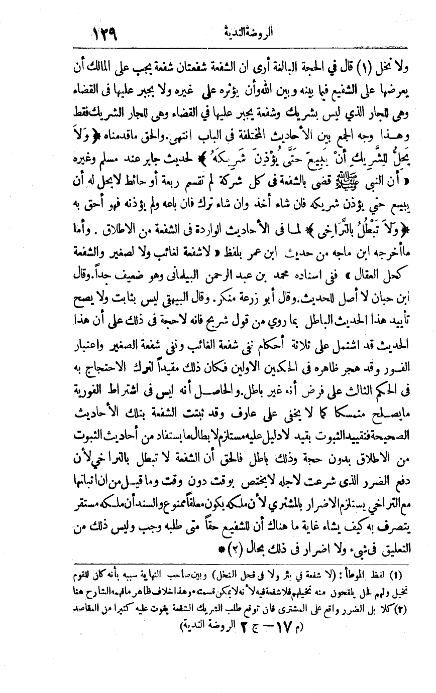 ولا نخل1 قال في الحجة البالغة: أرى أن الشفعة شفعتان شفعة يجب على المالك أن يعرضها على الشفيع فيما بينه وبين الله وأن يؤثره على غيره ولا يجبر عليها في القضاء وهي للجار الذي ليس بشريك وشفعة يجبر عليها في القضاء وهي للجار الشريك فقط وهذا وجه الجمع بين الأحاديث المختلفة في الباب انتهى والحق ما قدمناه "ولا يحل للشريك أن يبيع حتى يؤذن شريكه"لحديث جابر عند مسلم وغيره "أن النبي صلى الله عليه وسلم قضى بالشفعة في كل شركة لم تقسم ربعة أو حائط لا يحل له أن يبيع حتى يؤذن شريكه فإن شاء أخذ وإن شاء ترك فإن باعه ولم يؤذنه فهو أحق به " "ولا تبطل بالتراخي"لما في الأحاديث الواردة في الشفعة من الإطلاق وأما ما أخرجه ابن ماجه من حديث ابن عمر بلفظ "لا شفعة لغائب ولا لصغير والشفعة كحل العقال" ففي إسناده محمد بن عبد الرحمن البيلماني وهو ضعيف جدا وقال ابن حبان: لا أصل للحديث وقال أبو زرعة: منكر وقال البيهقي: ليس بثابت ولا يصح تأييد هذا الحديث الباطل بما روي من قول شريح فإنه لاحجة في ذلك على أن هذا الحديث قد اشتمل على ثلاثة أحكام: نفي شفعة الغائب ونفي شفعة الصغير واعتبار الفور وقد هُجر ظاهره في الحكمين الأولين فكان ذلك مقيدا لترك الاحتجاج به في الحكم الثالث على فرض أنه غير باطل. والحاصل: أنه ليس في اشتراط الفورية ما يصلح متمسكا كما لا يخفى على عارف وقد ثبتت الشفعة بتلك الأحاديث الصحيحة فتقييد الثبوت بقيد لا دليل عليه مستلزم لإبطال ما يستفاد من أحاديث الثبوت من الإطلاق بدون حجة وذلك باطل فالحق أن الشفعة لا تبطل بالتراخي لأن دفع الضرر الذي شرعت لأجله لا يختص بوقت دون وقت وما قيل من أن إثباتها مع التراخي يستلزم الإضرار بالمشتري لأنه ملكه يكون معلقا ممنوع والسند أن ملكه مستقر يتصرف به كيف يشاء غاية ما هناك أن للشفيع حقا متى طلبه وجب وليس ذلك من التعليق في شئ ولا إضرار في ذلك بحال2