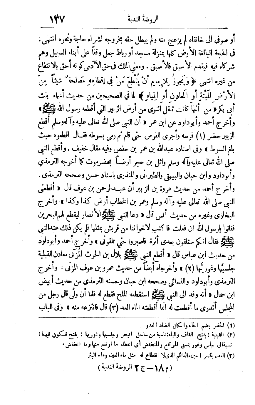 أو صوفي إلى خانقاه لم يزعج منه ولم يبطل حقه بخروجه لشراء حاجة ونحوه انتهى في الحجة البالغة: الأرض كلها بمنزلة مسجد أو رباط جعل وقفا على أبناء على أبناء السبيل وهم شركاء فيه فيقدم الأسبق فالأسبق ومعنى الملك في حق الآدمي كونه أحق كالإنتفاع من غير انتهى "ويجوز للإمام أن يقطع من في إقطاعه مصلحة شيئا من الأرض الميتة أو المعادن أو المياه"لما في الصحيحين من حديث أسماء بنت أبي بكر "من أنها كانت تنقل النوى من أرض الزبير التي أقطعه رسول الله صلى الله عليه وسلم "وأخرج أحمد وأبو داود عن ابن عمر "أن النبي صلى الله تعالى عليه وآله وسلم أقطع الزبير حضر1 فرسه وأجرى الفرس حتى قام ثم رمى بسوطه فقال: أقطعوه حيث بلغ السوط " وفي إسناده عبد الله بن عمر بن حفص وفيه مقال خفيف وأقطع النبي صلى الله تعالى عليه وآله وسلم وائل بن حجر أرضا بحضرموت كما أخرجه الترمذي وأبو داود وابن حبان والبيهقي والطبراني والمنذري بإسناد حسن وصححه الترمذي وأخرجه أحمد من حديث عروة بن الزبير أن عبد الرحمن بن عوف قال: "أقطعني النبي صلى الله تعالى عليه وآله وسلم وعمر بن الخطاب أرض كذا وكذا "وأخرج البخاري وغيره من حديث أنس قال: "دعا النبي صلى الله عليه وسلم الأنصار ليقطع لهم البحرين فقالوا يارسول الله: إن فعلت فاكتب لإخواننا من قريش بمثلها فلم يكن ذلك عند النبي صلى الله عليه وسلم فقال: " إنكم ستلقون بعدي أثرة فاصبروا حتى تلقوني" وأخرج أحمد وأبو داود من حديث ابن عباس قال: "أقطع النبي صلى الله عليه وسلم بلال بن الحرث المزني معادن القبلية جلسيّها وغوريّها2 "وأخرجاه أيضا من حديث عمرو بن عوف المزني وأخرج الترمذي وأبو داود والنسائي وصححه ابن حبان وحسنه الترمذي من حديث أبيض بن حمال "أنه وفد إلى النبي صلى الله عليه وسلم استقطعه الملح فقطع له فلما أن ولى قال رجل من المجلس: أتدري ما أقطعت له إنما أقطعته الماء العد3 قال: فانتزعه منه "وفي الباب
