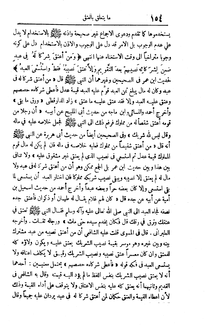 يستخدموها كما تقدم ودعوى الإجماع غير صحيحة وإذنه صلى الله عليه وسلم لا يدل على عدم الوجوب بل الأمر قد دل على الوجوب والإذن بالاستخدام دل على كونه وجوبا متراخيا إلى وقت الاستغناء عنها انتهى "ومن أعتق شركا له في عبد ضمن لشركائه نصيبهم بعد التقويم وإلا عتق نصيبه فقط واستُسعي العبد"لحديث ابن عمر في الصحيحين وغيرهما أن النبي صلى الله عليه وسلم قال: "من أعتق شركا له في عبد وكان له مال يبلغ ثمن العبد قوم عليه العبد قيمة عدل فأعطى شركاءه حصصهم وعتق عليه العبد وإلا فقد عتق عليه ما عتق" زاد الدارقطني "ورقّ ما بقي " وأخرج أحمد والنسائي وابن ماجه من حديث أبي المليح عن أبيه "أن رجلا من قومه أعتق شقصا له من مملوك فرُفع ذلك إلى النبي صلى الله عليه وسلم فجعل خلاصه عليه في ماله وقال ليس لله شريك "وفي الصحيحين أيضا من حديث أبي هريرة عن النبي صلى الله عليه وسلم أنه قال: "من أعتق شقيصا من مملوك فعليه خلاصه في ماله فإن لم يكن له مال قُوّم المملوك قيمة عدل ثم استُسعي في نصيب الذي لم يعتق غير مشقوق عليه" ولا تنافي بين هذا وبين حديث ابن عمر بل الجمع ممكن وهو أن من أعتق شركا له في عبد ولا مال له لم يعتق إلا نصيبه ويبقى نصيب شريكه مملوكا فإن اختار العبد أن يستسعي لما بقي استُسعي وإلا كان بعضه حرا وبعضه عبدا وأخرج أحمد من حديث إسمعيل بن أمية عن أبيه عن جده قال: "كان لهم غلام يقال له طهمان أو ذكوان فأعتق جده نصفه فجاء العبد إلى النبي صلى الله تعالى عليه وآله وسلم فقال النبي صلى الله عليه وسلم: " تعتق في عتقك وترق في رقك" قال: فكان يخدم سيده حتى مات "ورجاله ثقات وأخرجه الطبراني قال في المسوى: قلت عليه الشافعي أن من أعتق نصيبه من عبد مشترك بينه وبين غيره وهو موسر بقيمة نصيب الشريك يعتق عليه ويكون ولاؤه كله للمعتق وإن كان معسرا عتق نصيبه ونصيب الشريك رقيق لا يكلف إعتاقه ولا يستسعى العبد في فكه قوله: "فأعطى شركاءه حصصهم "يحتمل معنيين: أحمدهما أنه لا يعتق نصيب الشريك بنفس اللفظ ما لم يؤد إليه قيمته وقال به الشافعي في القديم وثانيهما أنه يعتق كله عليه بنفس الإعتاق ولا يتوقف على أداء القيمة وذلك لأن إعطاء القيمة والعتق حكمان لمن أعتق شركا له في عبد يردان عليه جميعا وقال