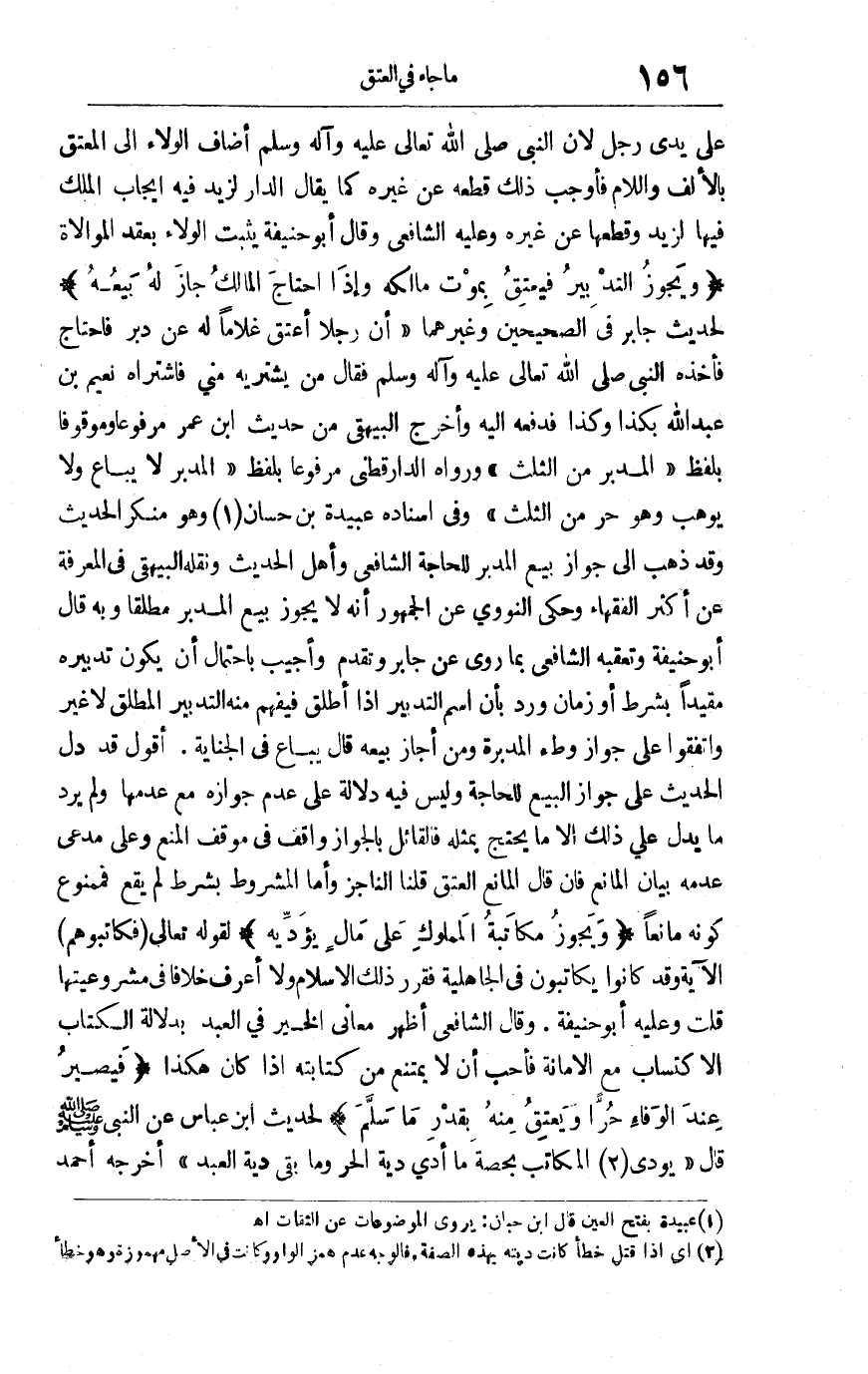 على يدي رجل لأن النبي صلى الله تعالى عليه وسلم أضاف الولاء إلى المعتق بالألف واللام فأوجب ذلك قطعه عن غيره كما يقال: الدار لزيد فيه إيجاب الملك فيها لزيد وقطعها عن غيره وعليه الشافعي وقال أبو حنيفة: يثبت الولاء بعقد الموالاة "ويجوز التدبير فيُعتق بموت مالكه وإذا احتاج المالك جاز له بيعه"لحديث جابر في الصحيحين وغيرهما "أن رجلا أعتق غلاما له عن دبر فاحتاج فأخذه النبي صلى الله تعالى عليه وآله وسلم فقال: من يشتريه مني فاشتراه نعيم بن عبد الله بكذا وكذا فدفعه إليه "وأخرج البيهقي من حديث ابن عمر مرفوعا وموقوفا بلفظ "المدبر من الثلث " ورواه الدارقطني مرفوعا بلفظ "المدبر لا يباع ولا يوهب وهو حر من الثلث" وفي إسناده عبيدة بن حسان1 وهو منكر الحديث وقد ذهب إلى جواز بيع المدبر للحاجة الشافعي وأهل الحديث ونقله البيهقي في المعرفة عن أكثر الفقهاء وحكى النووي عن الجمهور أنه لا يجوز بيع المدبر مطلقا وبه قال أبو حنيفة وتعقبه الشافعي بما روي عن جابر وتقدم وأجيب باحتمال أن يكون تدبيره مقيدا بشرط أو زمان ورد بأن اسم التدبير إذا أطلق فيفهم منه التدبير المطلق لا غير واتفقوا على جواز وطء المدبرة ومن أجاز بيعه قال يباع في الجناية. أقول: قد دل الحديث على جواز البيع للحاجة وليس فيه دلالة على عدم جوازه مع عدمها ولم يرد ما يدل على ذلك إلا ما يحتج بمثله فالقائل بالجواز واقف في موقف المنع وعلى مدعي عدمه بيان المانع فإن قال المانع العتق قلنا الناجز وأما المشروط بشرط لم يقع فممنوع كونه مانعا "ويجوز مُكاتبة المملوك على مال يؤديه"لقوله تعالى: {فَكَاتِبُوهُمْ} الآية وقد كانوا يكاتبون في الجاهلية فقرر ذلك الإسلام ولا أعرف خلافا في مشروعيتها قلت: وعليه أبو حنيفة وقال الشافعي أظهر معاني الخير في العبد بدلالة الكتاب الاكتساب مع الأمانة فأحب أن لا يمتنع من كتابته إذا كان هكذا "فيصير عند الوفاء حُراً ويُعتق منه بقدر ما سلم"لحديث ابن عباس عن النبي صلى الله عليه وسلم قال: "يودى2 المكاتب بحصة ما أدى دية الحر وما بقي دية العبد "أخرجه أحمد