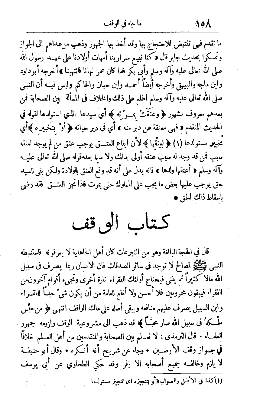 قال في الحجة البالغة: وهو من التبرعات كان أهل الجاهلية لا يعرفونه فاستنبطه النبي صلى الله عليه وسلم لمصالح لا توجد في سائر الصدقات فإن الإنسان ربما يصرف في سبيل الله مالا كثيرا ثم يفنى فيحتاج أولئك الفقراء تارة أخرى وتجيء أقوام آخرون من الفقراء فيبقون محرومين فلا أحسن ولا أنفع للعامة من أن يكون شئ حبسا للفقراء وابن السبيل يُصرف عليهم منافعه ويبقى أصله على ملك الواقف انتهى "من حبَّس ملكه في سبيل الله صار محبّسا"قد ذهب إلى مشروعية الوقف ولزومه جمهور العلماء قال الترمذي: لا نعلم بين الصحابة والمتقدمين من أهل العلم خلافا في جواز وقف الأرضين وجاء عن شريح أنه أنكره وقال أبو حنيفة: لا يلزم وخالفه جميع أصحابه إلا زفر وقد حكى الطحاوي عن أبي يوسف