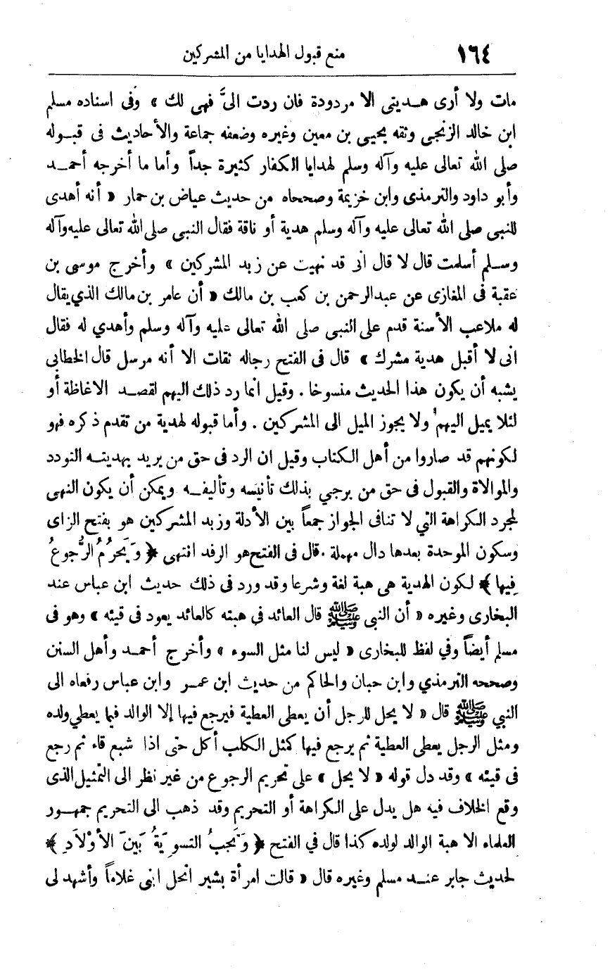 مات ولا أرى هديتي إلا مردودة فإن ردت إلي فهي لك " وفي إسناده مسلم بن خالد الزنجي وثقه يحيى بن معين وغيره وضعفه جماعة والأحاديث في قبوله صلى الله تعالى عليه وآله وسلم لهدايا الكفار كثيرة جدا وأما ما أخرجه أحمد وأبو داود والترمذي وابن خزيمة وصححاه من حديث عياض بن حمار "أنه أهدى للنبي صلى الله تعالى عليه وآله وسلم هدية أو ناقة فقال النبي صلى الله تعالى عليه وآله وسلم: أسلمت قال: لا قال: إني قد نهيت عن زبد المشركين" وأخرج موسى بن عقبة في المغازي عن عبد الرحمن بن كعب بن مالك "أن عامر بن مالك الذي يقال له ملاعب الأسنة قدم على النبي صلى الله تعالى عليه وآله وسلم وأهدى له فقال: "إني لا أقبل هدية مشرك" قال في الفتح: رجاله ثقات إلا أنه مرسل: قال الخطابي: يشبه أن يكون هذا الحديث منسوخا وقيل: إنما رد ذلك إليهم لقصد الإغاظة أو لئلا يميل إليهم ولا يجوز الميل إلى المشركين وأما قبوله لهدية من تقدم ذكره فهو لكونهم قد صاروا من أهل الكتاب وقيل: إن الرد في حق من يريد بهديته التودد والموالاة والقبول في حق من يرجى بذلك تأنيسه وتأليفه ويمكن أن يكون النهي لمجرد الكراهة التي لا تنافي الجواز جمعا بين الأدلة وزبد المشركين هو بفتح الزاي وسكون الموحدة بعدها دال مهملة قال في الفتح: هو الرفد انتهى. ويحرم الرجوع فيها لكون الهدية هي هبة لغة وشرعا وقد ورد في ذلك حديث ابن عباس عند البخاري وغيره "أن النبي صلى الله عليه وسلم قال: "العائد في هبته كالعائد يعود في قيئه" وهو في مسلم أيضا وفي لفظ للبخاري "ليس لنا مثل السوء" وأخرج أحمد وأهل السنن وصححه الترمذي وابن حبان والحاكم من حديث ابن عمر وابن عباس رفعاه إلى النبي صلى الله عليه وسلم قال: "لا يحل للرجل أن يعطي العطية فيرجع فيها إلا الوالد فيما يعطي ولده ومثل الرجل يعطي العطية ثم يرجع فيها كمثل الكلب أكل حتى إذا شبع قاء ثم رجع في قيئه "وقد دل قوله "لا يحل " على تحريم الرجوع من غير نظر إلى التمثيل الذي وقع الخلاف فيه هل يدل على الكراهة أو التحريم وقد ذهب إلى التحريم جمهور العلماء إلا هبة الوالد لولده كذا قال في الفتح "وتجب التسوية بين الأولاد"لحديث جابر عند مسلم وغيره قال: "قالت امرأة بشير انحل ابني غلاما وأشهد لي