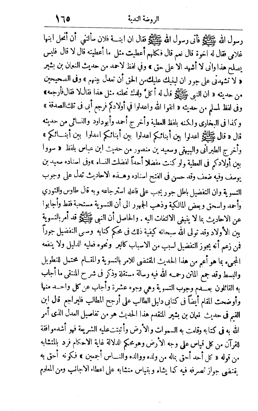 رسول الله صلى الله عليه وسلم فأتى رسول الله صلى الله عليه وسلم فقال: إن ابنة فلان سألتني أن أنحل ابنها غلامي فقال: له إخوة؟ قال: نعم قال: فكلهم أعطيت مثل ما أعطيته؟ قال: لا قال: فليس يصلح هذا وإني لا أشهد إلا على حق " وفي لفظ لأحمد من حديث النعمان بن بشير "لا تشهدني على جور إن لبنيك عليك من الحق أن تعدل بينهم " وفي الصحيحين من حديثه "أن النبي صلى الله عليه وسلم قال له: أكل ولدك نحلته مثل هذا؟ فقال: لا فقال فأرجعه " وفي لفظ لمسلم من حديثه "اتقوا الله واعدلوا في أولادكم" فرجع أبي في تلك الصدقة "وكذا في البخاري ولكنه بلفظ العطية وأخرج أحمد وأبو داود والنسائي من حديثه قال: "قال صلى الله عليه وسلم: " اعدلوا بين أبنائكم اعدلوا بين أبنائكم اعدلوا بين أبنائكم" وأخرج الطبراني والبيهقي وسعيد بن منصور من حديث ابن عباس بلفظ "سووا بين أولادكم في العطية ولو كنت مفضلا أحدا لفضلت النساء " وفي إسناده سعيد بن يوسف وفيه ضعف وقد حسن في الفتح إسناده وهذه الأحاديث تدل على وجوب التسوية وأن التفضيل باطل جور يجب على فاعله استرجاعه وبه قال طاوس والثوري وأحمد وإسحق وبعض المالكية وذهب الجمهور إلى أن التسوية مستحبة فقط وأجابوا عن الأحاديث بما لا ينبغي الالتفات إليه. والحاصل: أن النبي صلى الله عليه وسلم قد أمر بالتسوية بين الأولاد وقد تولى الله سبحانه كيفية ذلك في محكم كتابه وسمى التفضيل جورا فمن زعم أنه يجوز التفضيل لسبب من الأسباب كالبر ونحوه فعليه الدليل ولا ينفعه المجيء بما هو أعم من هذا الحديث المقتضي للأمر بالتسوية والمقام محتمل للتطويل والبسط وقد جمع الماتن رحمه الله فيه رسالة مستقلة وذكر في شرح المنتقى ما أجاب به القائلون بعد وجوب التسوية وهي وجوه عشرة وأجاب عن كل واحد منها وأوضحت المقام أيضا في كتابي دليل الطالب على أرجح المطالب فليراجع قال ابن القيم في حديث نعمان بن بشير المتقدم: هذا الحديث هو من تفاصيل العدل الذي أمر الله به في كتابه وقامت به السموات والأرض وأثبتت عليه الشريعة فهو أشد موافقة للقرآن من كل قياس على وجه الأرض وهو محكم الدلالة غاية الإحكام فرد بالمتشابه من قوله "كل أحد أحق بماله من ولده ووالده والناس أجمعين "فكونه أحق به يقتضي جواز تصرفه فيه كما يشاء وبقياس متشابه على إعطاء الأجانب ومن المعلوم