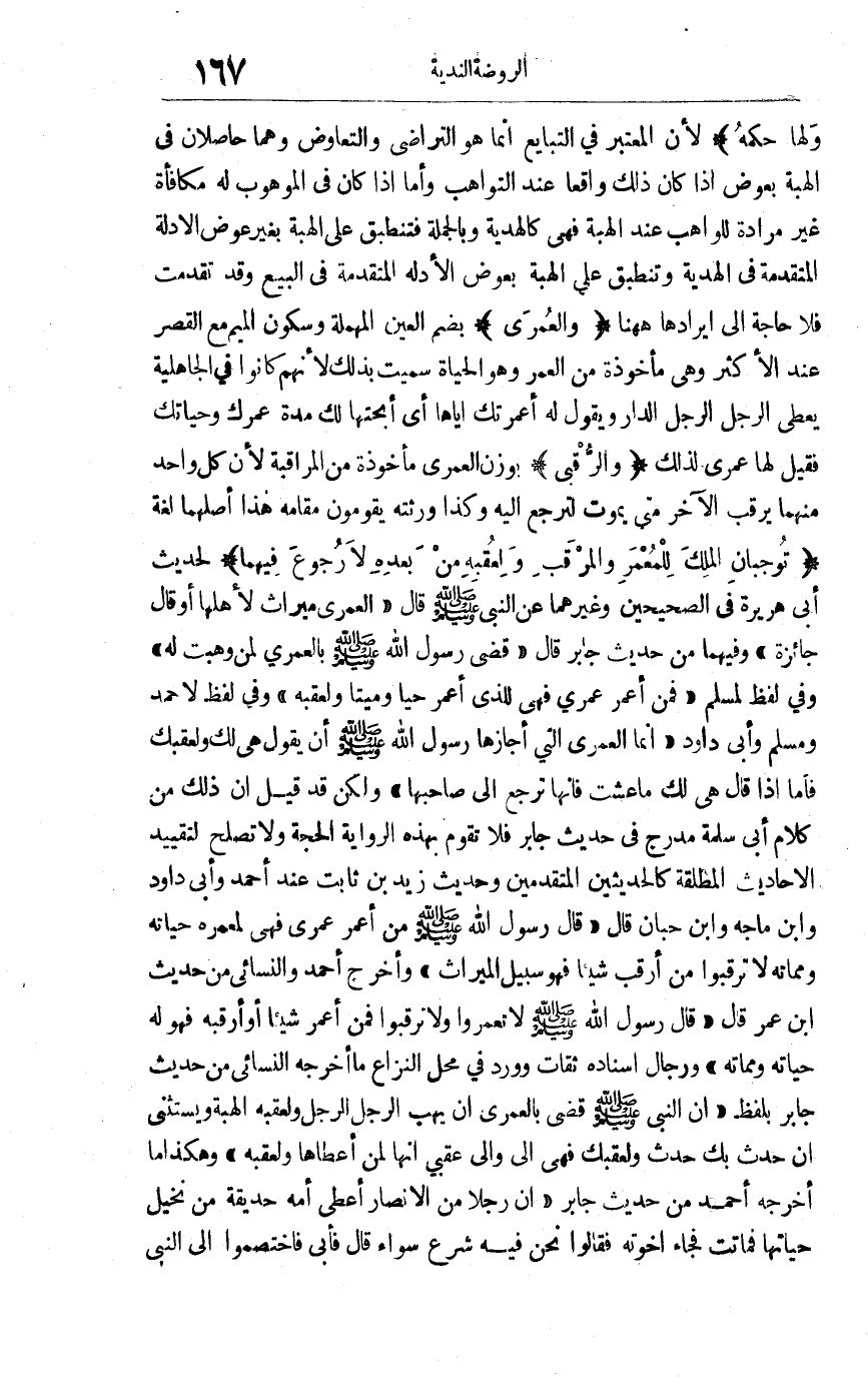 "والرقبى" بوزن العمرى مأخوذة من المراقبة لأن كل واحد منهما يرقب الآخر متى يموت لترجع إليه وكذا ورثته يقومون مقامه هذا أصلهما لغة "توجبان المُلك للمُعْمر والمُرقب ولعقبه من بعده لا رجوع فيهما"لحديث أبي هريرة في الصحيحين وغيرهما عن النبي صلى الله عليه وسلم قال: "العمرى ميراث لأهلها أو قال جائزة" وفيهما من حديث جابر قال: "قضى رسول الله صلى الله عليه وسلم بالعمرى لمن وهبت له "وفي لفظ لمسلم "فمن أُعمر عمرى فهي للذي أعمر حيا وميتا ولعقبه " وفي لفظ لأحمد ومسلم وأبي داود "إنما العمرى التي أجازها رسول الله صلى الله عليه وسلم أن يقول: هي لك ولعقبك فأما إذا قال: هي لك ما عشت فإنها ترجع إلى صاحبها "ولكن قد قيل إن ذلك من كلام أبي سلمة مدرج في حديث جابر فلا تقوم بهذه الرواية الحجة ولا تصلح لتقييد الأحاديث المطلقة كالحديثين المتقدمين وحديث زيد بن ثابت عند أحمد وأبي داود وابن ماجه وابن حبان قال: "قال رسول الله صلى الله عليه وسلم " من أعمر عمرى فهي لمعمره حياته ومماته لا ترقبوا من أرقب شيئا فهو سبيل الميراث" وأخرج أحمد والنسائي من حديث ابن عمر قال: "قال رسول الله صلى الله عليه وسلم: "لا تعمروا ولا ترقبوا فمن أعمر شيئا أو أرقبه فهو له حياته ومماته" ورجال إسناده ثقات وورد في محل النزاع ما أخرجه النسائي من حديث جابر بلفظ "أن النبي صلى الله عليه وسلم قضى بالعمرى أن يهب الرجل الرجل ولعقبه الهبة ويستثني إن حدث بك حدث ولعقبك فهي إلي وإلى عقبي أنها لمن أعطاها ولعقبه "وهكذا ما أخرجه أحمد من حديث جابر "أن رجلا من الأنصار أعطى أمه حديقة من نخيل حياتها فماتت فجاء إخوته فقالوا: نحن فيه شرع سواء قال: فأبى فاختصموا إلى النبي