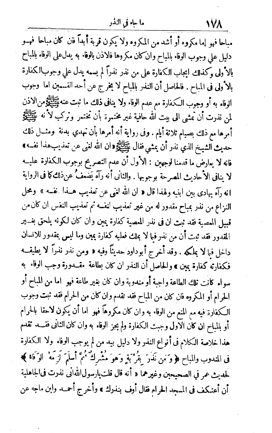 مباحا فهو إما مكروه أو أشد من المكروه ولا يكون قربة أبدا فإن كان مباحا فهو دليل على وجوب الوفاء بالمباح وإن كان مكروها فالإذن بالوفاء به يدل على الوفاء بالمباح بالأولى وكذلك إيجاب الكفارة على من نذر نذرا لم يسمه يدل على وجوب الكفارة بالأولى في المباح. فالحاصل: أن النذر بالمباح لا يخرج عن أحد القسمين إما وجوب الوفاء به أو وجوب الكفارة مع عدم الوفاء ولا ينافي ذلك ما ثبت عنه صلى الله عليه وسلم من الإذن لمن نذرت أن تمشي إلى بيت الله حافية غير مختمرة بأن تختمر وتركب لأنه صلى الله عليه وسلم أمرها مع ذلك بصيام ثلاثة أيام وفي رواية أنه أمرها بأن تهدي بدنة ومثل ذلك حديث الشيخ الذي نذر أن يمشي فقال صلى الله عليه وسلم "إن الله لغني عن تعذيب هذا نفسه" فإنه لا يعارض ما قدمنا لوجهين: الأول أن عدم التصريح بوجوب الكفارة عليه لا ينافي الأحاديث المصرحة بوجوبها والثاني أنه رآه يضعف عن ذلك كما في الرواية أنه رآه يهادى بين ابنيه ولهذا قال: "إن الله لغني عن تعذيب هذا نفسه" ومحل النزاع من نذر بمباح مقدرو له من غير تعذيب لنفسه ثم تعذيب النفس إن كان من قبيل المعصية فقد ثبت أن في نذر المعصية كفارة يمين وإن كان لكونه يلحق بغير المقدور فقد ثبت أن من نذر فيما لا يملك فعليه كفارة يمين وما ليس بمقدور للإنسان داخل فيما لا يملكه وقد أخرج أبو داود حديثا وفيه "ومن نذر نذرا لا يطيقه فكفارته كفارة يمين ". والحاصل: أن النذر إن كان بطاعة مقدورة وجب الوفاء به سواء كانت تلك الطاعة واجبة أو مندوبة وإن كان بغير طاعة فهو إما من المباح أو الحرام أو المكروه فإن كان من المباح فقد تقدم وإن كان من الحرام فقد ثبت وجوب الكفارة فيه مع المنع من الوفاء به وإن كان مكروها فهو إما أن يكون لاحقا بالحرام أو بالمباح إن كان الأول وجبت الكفارة ولم يجز الوفاء به وإن كان الثاني فقد تقدم هذا خلاصة الكلام في أنواع النذر ولا دليل بيد من لم يوجب الوفاء ولا الكفارة في المندوب والمباح "ومن نذر بقربة وهو مشرك ثم أسلم لزمه الوفاء"لحديث عمر في الصحيحين وغيرهما "أنه قال: قلت يارسول الله إني نذرت في الجاهلية أن أعتكف في المسجد الحرام فقال: "أوف بنذرك " وأخرج أحمد وابن ماجه عن