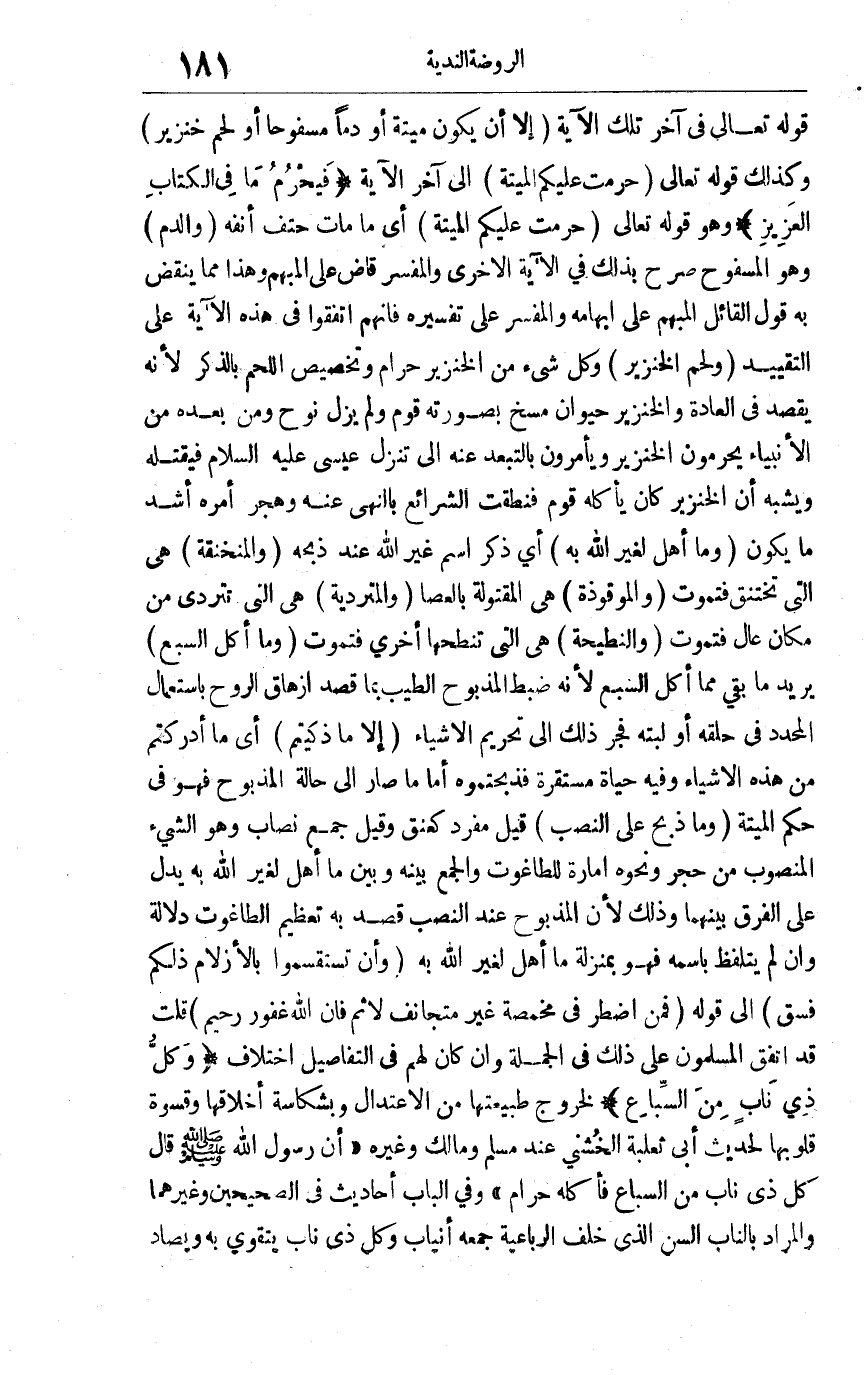 قوله تعالى في آخر تلك الآية: {إِلَّا أَنْ يَكُونَ مَيْتَةً أَوْ دَماً مَسْفُوحاً أَوْ لَحْمَ خِنْزِيرٍ} وكذلك قوله تعالى: {حُرِّمَتْ عَلَيْكُمُ الْمَيْتَةُ} إلى آخر الآية "فيحرم ما في الكتاب العزيز"وهو قوله تعالى: {حُرِّمَتْ عَلَيْكُمُ الْمَيْتَةُ} أي ما مات حتف أنفه {وَالدَّمَ} وهو المسفوح صرح بذلك في الآية الأخرى والمفسر قاض على المبهم وهذا مما ينقض به قول القائل المبهم على إبهامه والمفسر على تفسيره فإنهم اتفقوا في هذه الآية على التقييد {وَلَحْمَ الْخِنْزِيرِ} وكل شئ من الخنزيز حرام وتخصيص اللحم بالذكر لأنه يقصد في العادة والخنزير حيوان مسخ بصورته قوم ولم يزل نوح ومن بعده من الأنبياء يحرمون الخنزير ويأمرون بالتبعد عنه إلى تنزل عيسى عليه السلام فيقتله ويشبه أن الخنزير كان يأكله قوم فنطقت الشرائع بالنهي عنه وهجر أمره أشد ما يكون {وَمَا أُهِلَّ لِغَيْرِ اللَّهِ بِهِ} أي ذكر اسم غير الله عند ذبحه {وَالْمُنْخَنِقَةُ} هي التي تختنق فتموت {وَالْمَوْقُوذَةُ} هي المقتولة بالعصا {وَالْمُتَرَدِّيَةُ} هي التي تتردى من مكان عال فتموت {وَالنَّطِيحَةُ} هي التي تنطحها أخرى فتموت {وَمَا أَكَلَ السَّبُعُ} يريد ما بقي مما أكل السبع لأنه ضبط المذبوح الطيب بما قصد إزهاق الروح باستعمال المحدد في حلفه أو لبته فجرّ ذلك إلى تحريم الأشياء {إِلَّا مَا ذَكَّيْتُمْ} أي ما أدركتم من هذه الأشياء وفيه حياة مستقرة فذبحتموه أما ما صار إلى حالة المذبوح فهو في حكم الميتة {وَمَا ذُبِحَ عَلَى النُّصُبِ} قيل: مفرد كعنق وقيل: جمع نصاب وهو الشئ المنصوب من حجر ونحوه أمارة للطاغوت والجمع بينه وبين ما أهل لغير الله به يدل على الفرق بينهما وذلك لأن المذبوح عند النصب قصد به تعظيم الطاغوت دلالة وإن لم يتلفظ باسمه فهو بمنزلة ما أهل الغير الله به {وَأَنْ تَسْتَقْسِمُوا بِالْأَزْلامِ ذَلِكُمْ فِسْقٌ} إلى قوله {فَمَنِ اضْطُرَّ فِي مَخْمَصَةٍ غَيْرَ مُتَجَانِفٍ لإِثْمٍ فَإِنَّ اللَّهَ غَفُورٌ} قلت قد اتفق المسلمون على ذلك في الجملة وإن كان لهم في التفاصيل اختلاف "وكل ذي ناب من السباع"لخروج طبيعتها من الاعتدال وبشكاسة أخلاقها وقسوة قلوبها لحديث أبي ثعلبة الخشني عند مسلم ومالك وغيره "أن رسول الله صلى الله عليه وسلم قال "كل ذي ناب من السباع فأكله حرام" وفي الباب أحاديث في الصحيحين وغيرهما والمراد بالناب السن الذي خلف الرباعية جمعه أنياب وكل ذي ناب يتقوى به ويصاد