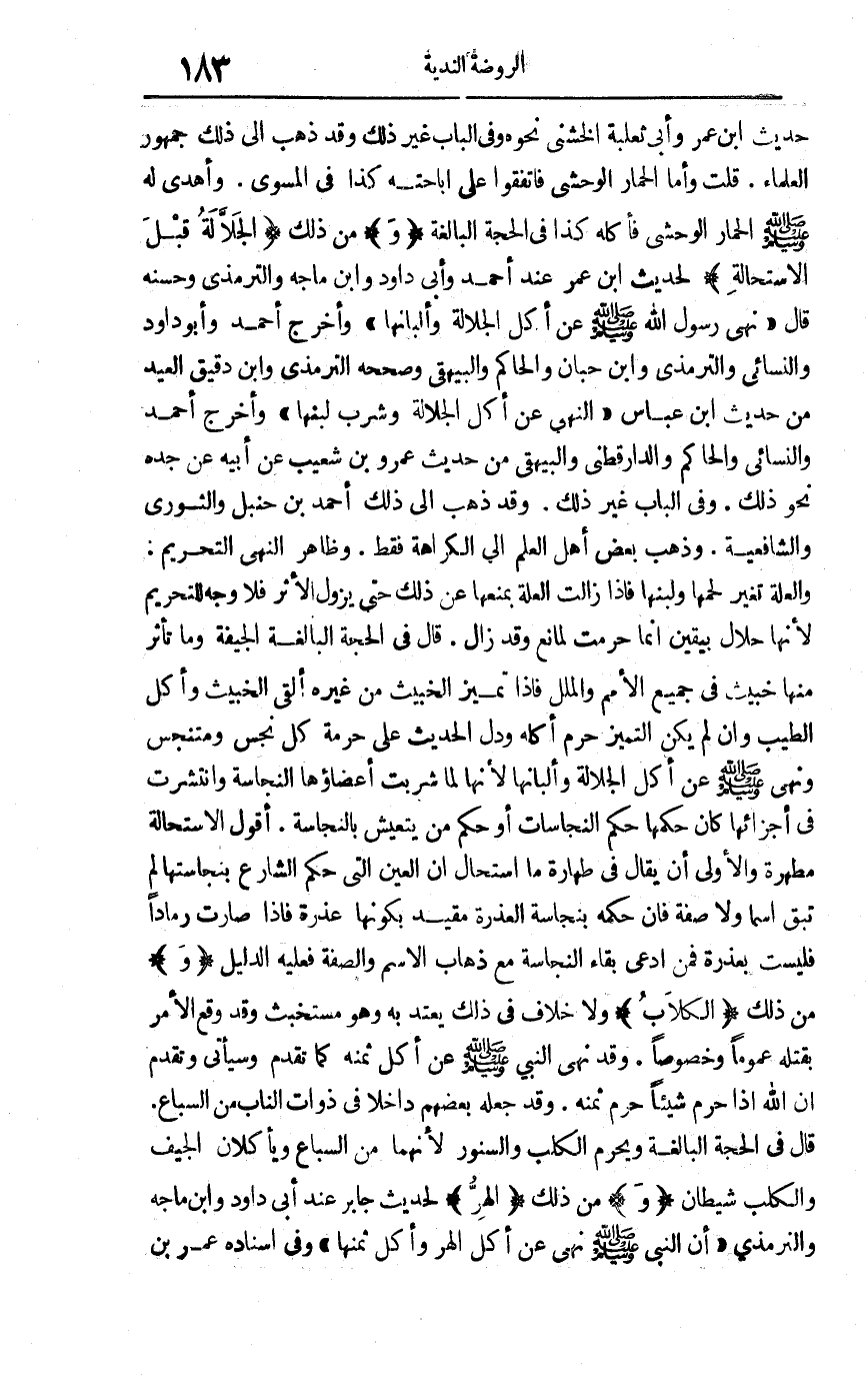حديث ابن عمر وأبي ثعلبة الخشني نحوه وفي الباب غير ذلك وقد ذهب إلى ذلك جمهور العلماء قلت: وأما الحمار الوحشي فاتفقوا على إباحته كذا في المسوى وأهدي له صلى الله عليه وسلم الحمار الوحشي فأكله كذا في الحجة البالغة "و"من ذلك "الجلالة قبل الاستحالة"لحديث ابن عمر عند أحمد وأبي داود وابن ماجه والترمذي وحسنه قال: "نهى رسول الله صلى الله عليه وسلم عن أكل الجلالة وألبانها "وأخرج أحمد وأبو داود والنسائي والترمذي وابن حبان والحاكم والبيهقي وصححه الترمذي وابن دقيق العيد من حديث ابن عباس "النهي عن أكل الجلالة وشرب لبنها "وأخرج أحمد والنسائي والحاكم والدارقطني والبيهقي من حديث عمرو بن شعيب عن أبيه عن جده نحو ذلك وفي الباب غير ذلك وقد ذهب إلى ذلك أحمد بن حنبل والثوري والشافعية وذهب بعض أهل العلم إلى الكراهة فقط وظاهر النهي التحريم والعلة تغير لحمها ولبنها فإذا زالت العلة بمنعها عن ذلك حتى يزول الأثر فلا وجه للتحريم لأنها حلال بيقين إنما حرمت لمانع وقد زال قال في الحجة البالغة: الجيفة وما تأثر منها خبيث في جميع الأمم والملل فإذا تميز الخبيث من غيره ألقي الخبيث وأكل الطيب وإن لم يكن التميز حرم أكله ودل الحديث على حرمة كل نجس ومتنجس ونهى صلى الله عليه وسلم عن أكل الجلالة وألبانها لأنها لما شربت أعضاؤها النجاسة وانتشرت في أجزائها كان حكمها حكم النجاسات أو حكم من يتعيش بالنجاسة أقول: الاستحالة مطهرة والأولى أن يقال في طهارة ما استحال إن العين التي حكم الشارع بنجاستها لم تبق اسما ولا صفة فإن حكمه بنجاسة العذرة مقيد بكونها عذرة فإذا صارت رمادا فليست بعذرة فمن ادعى بقاء النجاسة مع ذهاب الاسم والصفة فعليه الدليل "و"من ذلك "الكلاب"ولا خلاف في ذلك يعتد به وهو مستخبث وقد وقع الأمر بقتله عموما وخصوصا وقد نهى النبي صلى الله عليه وسلم عن أكل ثمنه كما تقدم وسيأتي وتقدم أن الله إذا حرم شيئا حرم ثمنه وقد جعله بعضهم داخلا في ذوات الناب من السباع قال في الحجة البالغة: ويحرم الكلب والسنور لأنهما من السباع ويأكلان الجيف والكلب شيطان "و"من ذلك "الهر"لحديث جابر عن أبي داود وابن ماجه والترمذي "أن النبي صلى الله عليه وسلم نهى عن أكل الهر وأكل ثمنها "وفي إسناده عمر بن