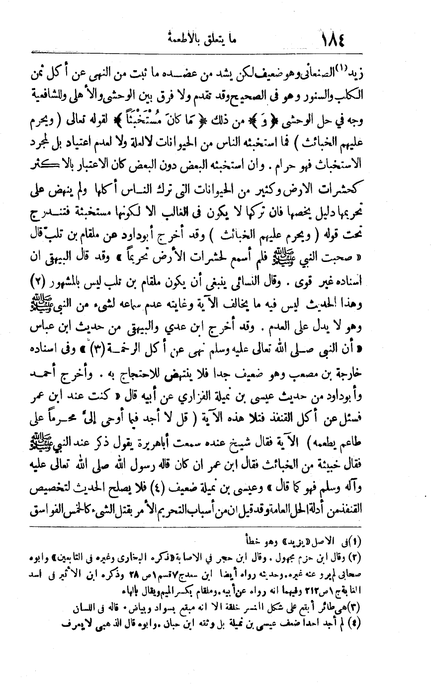 زيد1 الصنعاني وهو ضعيف لكن يشد من عضده ما ثبت من النهي عن أكل ثمن الكلب والسنور وهو في الصحيح وقد تقدم ولا فرق بين الوحشي والأهلي وللشافعية وجه في حل الوحشي "و"من ذلك "ما كان مستخبثا" لقوله تعالى: {وَيُحَرِّمُ عَلَيْهِمُ الْخَبَائِثَ} فما استخبثه الناس من الحيوانات لا لعلة ولا لعدم اعتياد بل لمجرد الاستخباث فهو حرام وإن استخبثه البعض دون البعض كان الاعتبار بالأكثر كحشرات الأرض وكثير من الحيوانات التي ترك الناس أكلها ولم ينهض على تحريمها دليل يخصها فإن تركها لا يكون في الغالب إلا لكونها مستخبثة فتندرج تحت قوله {وَيُحَرِّمُ عَلَيْهِمُ الْخَبَائِثَ} وقد أخرج أبو داود عن ملقام بن تلب قال "صحبت النبي صلى الله عليه وسلم فلم أسمع لحشرات الأرض تحريما "وقد قال البيهقي: إن إسناده غير قوي وقال النسائي: ينبغي أن يكون ملقام بن تلب ليس بالمشهور2 وهذا الحديث ليس فيه ما يخالف الآية وغايته عدم سماعه لشئ من النبي صلى الله عليه وسلم وهو لا يدل على العدم وقد أخرج ابن عدي والبيهقي من حديث ابن عباس "أن النبي صلى الله تعالى عليه وسلم نهى عن أكل الرخمة3 "وفي إسناده خارجة بن مصعب وهو ضعيف جدا فلا ينتهض للاحتجاج به وأخرج أحمد وأبو داود من حديث عيسى بن نميلة الفزازي عن أبيه قال "كنت عند ابن عمر فسئل عن أكل القنقذ فتلا هذه الآية {قُلْ لا أَجِدُ فِي مَا أُوحِيَ إِلَيَّ مُحَرَّماً عَلَى طَاعِمٍ يَطْعَمُهُ} الآية فقال شيخ عنده: سمعت أبا هريرة يقول ذكر عند النبي صلى الله عليه وسلم فقال: خبيثة من الخبائث فقال ابن عمر: إن كان قاله رسول الله صلى الله تعالى عليه وآله وسلم فهو كما قال "وعيسى بن نميلة ضعيف4 فلا يصلح الحديث لتخصيص القنفذ من أدلة الحل العامة وقد قيل إن من أسباب التحريم الأمر بقتل الشئ كالخمس الفواسق