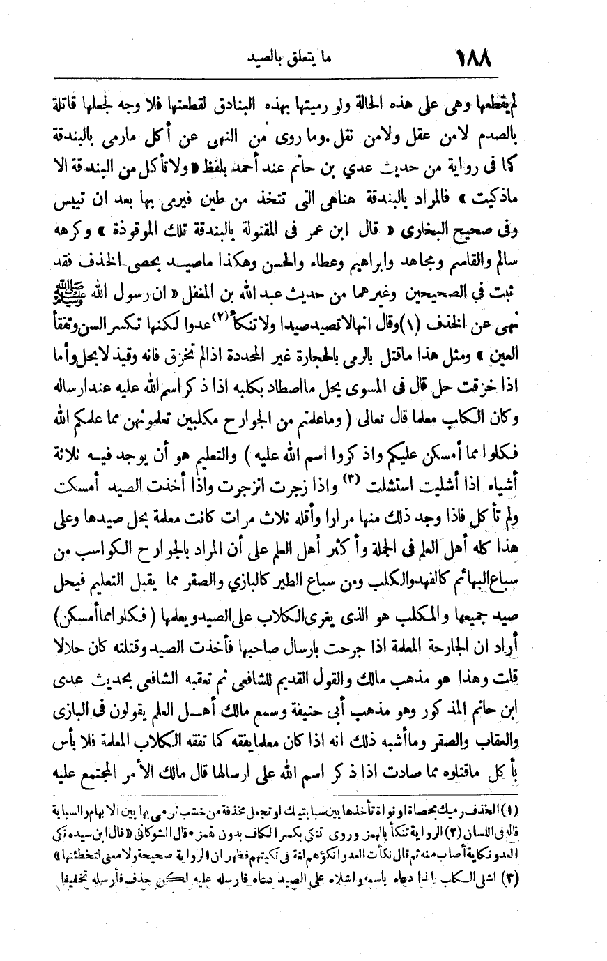 لم يقطعها وهي على هذه الحالة ولو رميتها بهذه البنادق لقطعتها فلا وجه لجعلها قاتلة بالصدم لا من عقل ولا من نقل وما روي من النهي عن أكل ما رمي بالبندقة كما في رواية من حديث عدي بن حاتم عند أحمد بلفظ "ولا تأكل من البندقة إلا ما ذكيت "فالمراد بالبندقة هنا هي التي تتخذ من طين فيرمي بها بعد أن تيبس وفي صحيح البخاري "قال ابن عمر في المقتولة بالبندقية تلك الموقوذة "وكرهه سالم والقاسم ومجاهد وإبراهيم وعطاء والحسن وهكذا ما صيد بحصى الخذف فقد ثبت في الصحيحين وغيرهما من حديث عبد الله بن المغفل "أن رسول الله صلى الله عليه وسلم نهى عن الخذف1 وقال: إنها لا تصيد صيدا ولا تنكأ2 عدوا لكنها تكسر السن وتفقأ العين "ومثل هذا ما قتل بالرمي بالحجارة غير المحدودة إذا لم تخزق فإنه وقيذ لا يحل وأما إذا خزقت حل قال في المسوى: يحل ما اصطاد بكلبه إذا ذُكر اسم الله عليه وعند إرساله وكان الكلب معلما قال تعالى: {وَمَا عَلَّمْتُمْ مِنَ الْجَوَارِحِ مُكَلِّبِينَ تُعَلِّمُونَهُنَّ مِمَّا عَلَّمَكُمُ اللَّهُ فَكُلُوا مِمَّا أَمْسَكْنَ عَلَيْكُمْ وَاذْكُرُوا اسْمَ اللَّهِ عَلَيْهِ} والتعليم هو أن يوجد فيه ثلاثة أشياء: إذا أُشليت استشلت3 وإذا أخذت الصيد أمسكت ولم تأكل فإذا وجد ذلك منها مرارا وأقله ثلاث مرات كانت معلمة يحل صيدها وعلى هذا كله أهل العلم في الجملة وأكثر أهل العلم على أن المراد بالجوارح الكواسب من سباع البهائم كالفهد والكلب ومن سباع الطير كالبازي والصقر مما يقبل التعليم فيحل صيد جميعها والمكلب هو الذي يغري الكلاب على الصيد ويعلمها {فَكُلُوا مِمَّا أَمْسَكْنَ} أراد أن الجارحة المعلمة إذا جرحت بإرسال صاحبها فأخذت الصيد وقتلته كان حلالا قلت: وهذا هو مذهب مالك والقول القديم للشافعي ثم تعقبه الشافعي بحديث عدي ابن حاتم المذكور وهو مذهب أبي حنيفة وسمع مالك أهل العلم يقولون في البازي والعقاب والصقر وما أشبه ذلك إنه إذا كان معلما يفقه كما تفقه الكلاب المعلمة فلا بأس بأكل ما قتلوه مما صادت إذا ذكر اسم الله على إرسالها قال مالك: الأمر المجتمع عليه