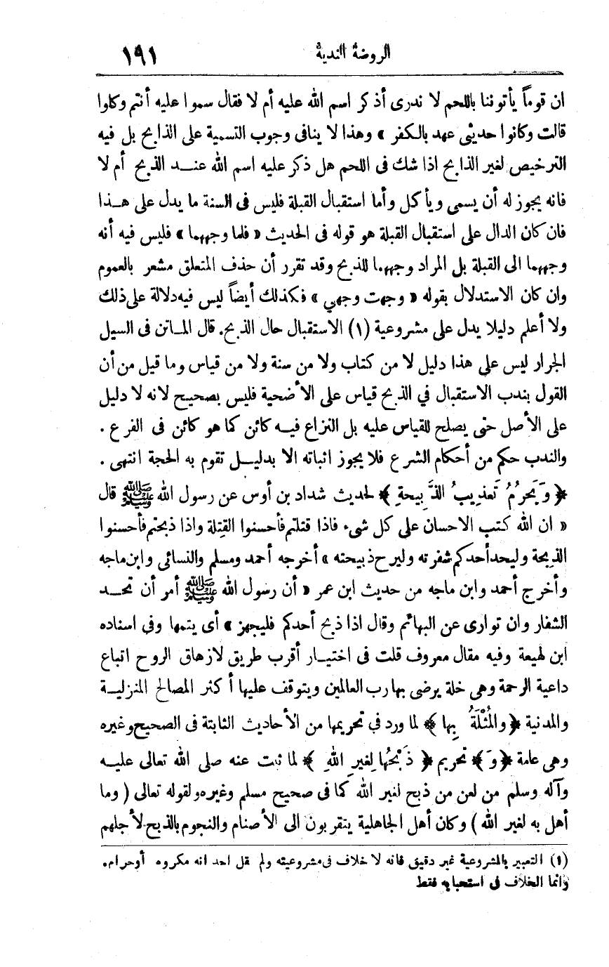 إن قوما يأتوننا باللحم لا ندري أذكر اسم الله عليه أم لا فقال: سموا عليه أنتم وكلوا قالت: وكانوا حديثي عهد بالكفر "وهذا لا ينافي وجوب التسمية على الذابح بل فيه الترخيص لغير الذابح إذا شك في اللحم هل ذكر عليه اسم الله عند الذبح أم لا فإنه يجوز له أن يسمي ويأكل وأما استقبال القبلة فليس في السنة ما يدل على هذا فإن كان الدال على استقبال القبلة هو قوله في الحديث "فما وجههما "فليس فيه أنه وجههما إلى القبلة بل المراد وجههما للذبح وقد تقرر أن حذف المتعلق مشعر بالعموم وإن كان الاستدلال بقوله "وجهت وجهي "فكذلك أيضا ليس فيه دلالة على ذلك ولا أعلم دليلا على مشروعية1 الاستقبال حال الذبح قال الماتن في السيل الجرار: ليس على هذا دليل لا من كتاب ولا من سنة ولا من قياس وما قيل من أن القول بندب الاستقبال في الذبح قياس على الأضحية فليس بصحيح لأنه لا دليل على الأصل حتى يصلح للقياس عليه بل النزاع فيه كائن كما هو كائن في الفرع والندب حكم من أحكام الشرع فلا يجوز إثباته إلا بدليل تقوم به الحجة انتهى "ويحرم تعذيب الذبيحة"لحديث شداد بن أوس عن رسول الله صلى الله عليه وسلم قال: "إن الله كتب الإحسان على كل شئ فإذا قتلتم فأحسنوا القتلة وإذا ذبحتم فأحسنوا الذبحة وليحد أحكم شفرته وليرح ذبيحته" أخرجه أحمد ومسلم والنسائي وابن ماجه وأخرج أحمد وابن ماجه من حديث ابن عمر "أن رسول الله صلى الله عليه وسلم أمر أن تحد الشفار وأن توارى عن البهائم وقال: إذا ذبح أحدكم فليجهز "أي يتمها وفي إسناده ابن ليهعة وفيه مقال معروف قلت في اختيار أقرب طريق لإزهاق الروح اتباع داعية الرحمة وهي خلة يرضى بها رب العالمين ويتوقف عليها أكثر المصالح المنزلية والمدنية "والمثلة بها"لما ورد في تحريمها من الأحاديث الثابتة في الصحيح وغيره وهي عامة "و"تحريم "ذبحها لغير الله"لما ثبت عنه صلى الله تعالى عليه وآله وسلم من لعن من ذبح لغير الله كما في صحيح مسلم وغيره ولقوله تعالى: {وَمَا أُهِلَّ بِهِ لِغَيْرِ اللَّهِ} وكان أهل الجاهلية يتقربون إلى الأصنام والنجوم بالذبح لأجلهم