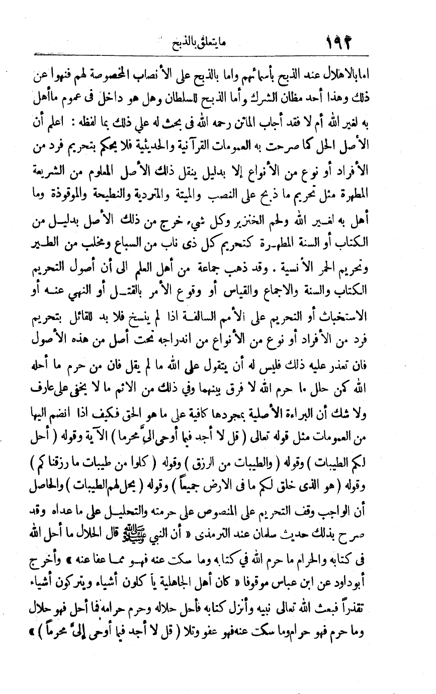 إما بالإهلال عند الذبح بأسمائهم وإما بالذبح على الأنصاب المخصوصة لهم فنهوا عن ذلك وهذا أحد مظان الشرك وأما الذبح للسطان وهل هو داخل في عموم ما أهل به لغير الله أم لا؟ فقد أجاب الماتن رحمه الله في بحث له على ذلك بما لفظه: اعلم أن الأصل الحل كا صرحت به العمومات القرآنية والحديثية فلا يحكم بتحريم فرد من الأفراد أو نوع من الأنواع إلا بدليل ينقل ذلك الأصل المعلوم من الشريعة المطهرة مثل: تحريم ما ذبح على النصب والميتة والمتردية والنطيحة والموقوذة وما أهل به لغير الله ولحم الخنزيز وكل شئ خرج من ذلك الأصل بدليل من الكتاب أو السنة المطهرة كتحريم كل ذي ناب من السباع ومخلب من الطير وتحريم الحمر الإنسية وقد ذهب جماعة من أهل العلم إلى أن أصول التحريم الكتاب والسنة والإجماع والقياس أو وقوع الأمر بالقتل أو النهي عنه أو الاستخباث أو التحريم على الأمم السالفة إذا لم ينسخ فلا بد للقائل بتحريم فرد من الأفراد أو نوع من الأنواع من اندراجه تحت أصل من هذه الأصول فإن تعذر عليه ذلك فليس له أن يتقول على الله ما لم يقل فإن من حرم ما أحله الله كمن حلل ما حرم الله لا فرق بينهما وفي ذلك من الإثم ما لا يخفى على عارف ولا شك أن البراءة الأصلية بمجردها كافية على ما هو الحق فكيف إذا انضم إليها من العمومات مثل: قوله تعالي: {قُلْ لا أَجِدُ فِي مَا أُوحِيَ إِلَيَّ مُحَرَّماً} الآية وقوله: {أُحِلَّ لَكُمُ الطَّيِّبَاتُ} وقوله: {وَالطَّيِّبَاتِ مِنَ الرِّزْقِ} وقوله: {كُلُوا مِنْ طَيِّبَاتِ مَا رَزَقْنَاكُمْ} وقوله: {هُوَ الَّذِي خَلَقَ لَكُمْ مَا فِي الْأَرْضِ جَمِيعاً} وقوله: {وَيُحِلُّ لَهُمُ الطَّيِّبَاتِ} والحاصل أن الواجب وقف التحريم على المنصوص على حرمته والتحليل على ما عداه وقد صرح بذلك حديث سلمان عند الترمذي "أن النبي صلى الله عليه وسلم قال: الحلال ما أحل الله في كتابه والحرام ما حرم الله في كتابه وما سكت عنه فهو مما عفا عنه" وأخرج أبو داود عن ابن عباس موقوفا "كان أهل الجاهلية يأكلون أشياء ويتركون أشياء تقذرا فبعث الله تعالى نبيه وأنزل كتابه فأحل حلاله وحرم حرامه فما أحل فهو حلال وما حرم فهو حرام وما سكت عنه فهو عفو وتلا {قُلْ لا أَجِدُ فِي مَا أُوحِيَ إِلَيَّ مُحَرَّماً}