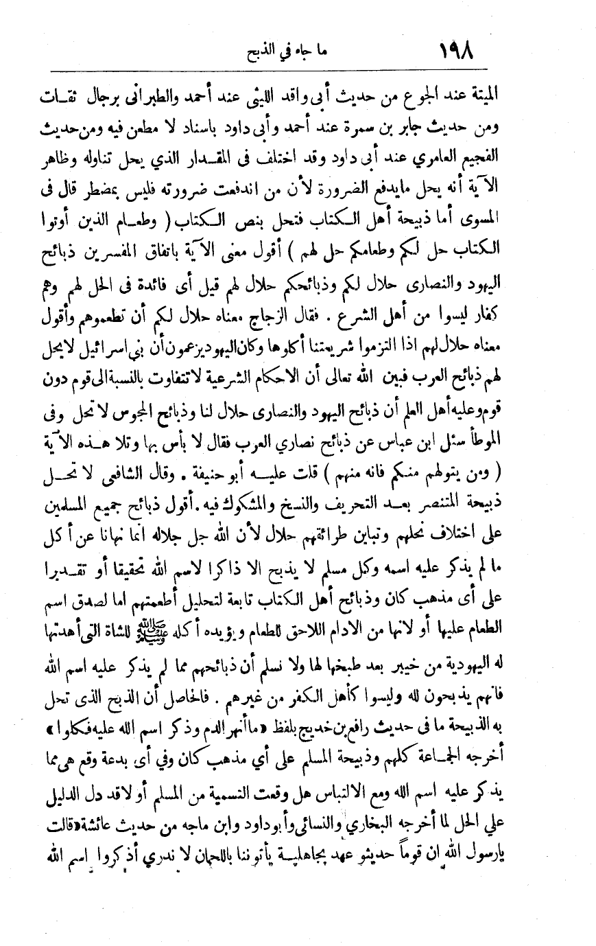 الميتة عن الجوع من حديث أبي وافد الليني عند أحمد والطبراني برجال ثقات ومن حديث جابر بن سمرة عند أحمد وأبي داود بإسناد لا مطعن فيه ومن حديث الفجيع العامري عند أبي داود وقد اختلف في المقدار الذي يحل تناوله وظاهر الآية أنه يحل ما يدفع الضرورة لأن من اندفعت ضرورته فليس بمضطر قال في المستوى: أما ذبائح أهل الكتاب فتحل بنص الكتاب {وَطَعَامُ الَّذِينَ أُوتُوا الْكِتَابَ حِلٌّ لَكُمْ وَطَعَامُكُمْ حِلٌّ لَهُمْ} أقول: معنى الآية باتفاق المفسرين ذبائح اليهود والنصارى حلال لكم وذبائحكم حلال لهم قيل: أي فائدة في الحل لهم وهم كفار ليسوا من أهل الشرع فقال الزجاج: معناه حلال لكم أن تطعموهم وأقول معناه: حلال لهم إذا التزموا شريعتنا أكلوها وكان اليهود يزعمون أن بني إسرائيل لا يحل لهم ذبائح العرب فبين الله تعالى أن الأحكام الشرعية لا تتفاوت بالنسبة إلى قوم دون قوم وعليه أهل العلم أن ذبائح اليهود والنصارى حلال لنا وذبائح المجوس لا تحل وفي الموطإ سئل ابن عباس عن ذبائح نصارى العرب فقال: لا بأس بها وتلا هذه الآية {ومن يتولهم منكم فإنه منهم} قلت عليه أبو حنيفة وقال الشافعي: لا تحل ذبيحة المنتصر بعد التحريف والنسخ والمشكوك فيه. أقول: ذبائح جميع المسلمين على اختلاف نحلهم وتباين طرائقهم حلال لأن الله جل جلاله إنما نهانا عن أكل ما لم يذكر عليه اسمه وكل مسلم لا يذبح إلا ذاكرا لاسم الله تحقيقا أو تقديرا على أي مذهب كان وذبائح أهل الكتاب تابعة لتحليل أطعمتهم إما لصدق اسم الطعام عليها أو لأنها من الإدام اللاحق للطعام ويؤيده أكله صلى الله عليه وسلم للشاة التي أهدتها له اليهودية من خيبر بعد طبخها لها ولا نسلم أن ذبائحهم مما لم يذكر عليه اسم الله فإنهم يذبحون لله وليسوا كأهل الكفر من غيرهم. فالحاصل: أن الذبح الذي تحل به الذبيحة ما في حديث رافع بن خديج بلفظ "ما أنهر الدم وذكر اسم الله عليه فكلوا " أخرجه الجماعة كلهم وذبيحة المسلم على أي مذهب كان وفي أي بدعة وقع هي مما يذكر عليه اسم الله ومع الالتباس هل وقعت التسمية من المسلم أولا قد دل الدليل على الحل لما أخرجه البخاري والنسائي وأبو داود وابن ماجه من حديث عائشة "قالت يا رسول الله: إن قوما حديثو عهد بجاهلية يأتوننا باللحمان لا ندري أذكروا اسم الله