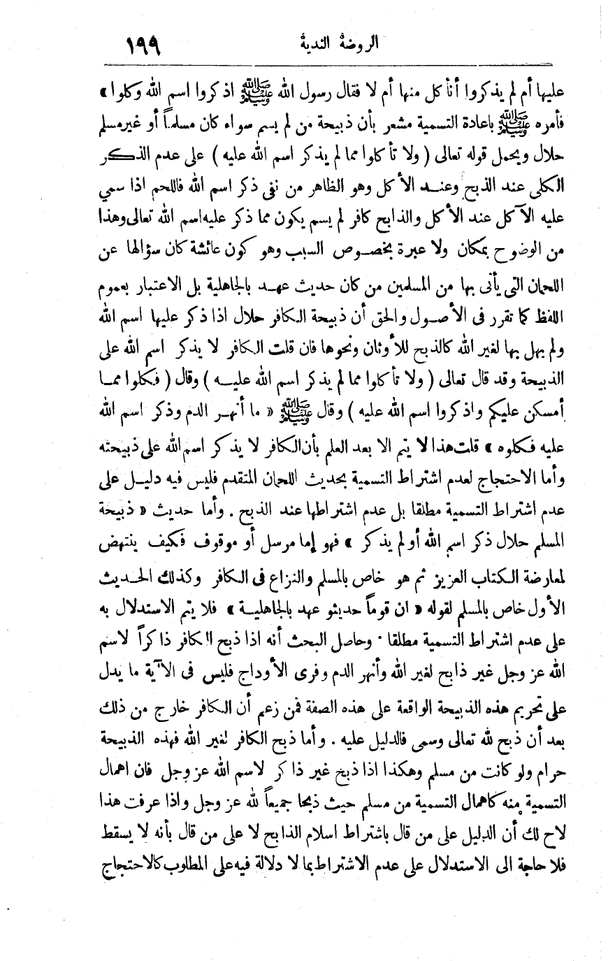 عليها أم لم يذكروا أنأكل منها أم لا؟ فقال رسول الله صلى الله عليه وسلم: اذكروا اسم الله وكلوا " فأمره صلى الله عليه وسلم بإعادة التسمية مشعر بأن ذبيحة من لم يسم سواء كان مسلما أو غيره مسلم حلال ويحمل قوله تعالى: {وَلا تَأْكُلُوا مِمَّا لَمْ يُذْكَرِ اسْمُ اللَّهِ عَلَيْهِ} على عدم الذكر الكلي عند الذبح وعند الأكل وهو الظاهر من نفي ذكر اسم الله فاللحم إذا سمى عليه الآكل عند الأكل والذابح كافر لم يسم يكون مما ذكر عليه اسم الله تعالى وهذا من الوضوح بمكان ولا عبرة بخصوص السبب وهو كون عائشة كان سؤالها عن اللحمان التي يأتي بها من المسلمين من كان حديث عهد بالجاهلية بل الاعتبار بعموم اللفظ كما تقرر في الأصول والحق أن ذبيحة الكافر حلال إذا ذكر عليها اسم الله ولم يهل بها لغير الله كالذبح للأوثان ونحوها فإن قلت الكافر لا يذكر اسم الله على الذبيحة وقد قال تعالى: {وَلا تَأْكُلُوا مِمَّا لَمْ يُذْكَرِ اسْمُ اللَّهِ عَلَيْهِ} وقال: {فَكُلُوا مِمَّا أَمْسَكْنَ عَلَيْكُمْ وَاذْكُرُوا اسْمَ اللَّهِ عَلَيْهِ} وقال صلى الله عليه وسلم: "ما أنهر الدم وذكر اسم الله عليه فكلوه" قلت: هذا لا يتم إلا بعد العلم بأن الكافر لا يذكر اسم الله على ذبيحته وأما الاحتجاج لعدم اشتراط التسمية بحديث اللحمان المتقدم فليس فيه دليل على عدم اشتراط التسمية مطلقا بل عدم اشتراطها عند الذبح وأما حديث "ذبيحة المسلم حلال ذكر اسم الله أو لم يذكر " فهو إما مرسل أو موقوف فكيف ينتهض لمعارضة الكتاب العزيز ثم هو خاص بالمسلم والنزاع في الكافر وكذلك الحديث الأول خاص بالمسلم لقوله: "إن قوما حديثو عهد بالجاهلية "فلا يتم الاستدلال به على عدم التسمية مطلقا. وحاصل البحث: أنه إذا ذبح الكافر ذاكرا لاسم الله عز وجل غير ذابح لغير الله وأنهر الدم وفرى الأوداج فليس في الآية ما يدل على تحريم هذه الذبيحة الواقعة على هذه الصفة فمن زعم أن الكافر خارج من ذلك بعد أن ذبح لله تعالى وسمى فالدليل عليه وأما ذبح الكافر لغير الله فهذه الذبيحة حرام ولو كانت من مسلم وهكذا إذا ذبح غير ذاكر لاسم الله عز وجل فإن إهمال التسمية منه كإهمال التسمية من مسلم حيث ذبحا جميعا لله عز وجل وإذا عرفت هذا لاح لك أن الدليل على من قال باشتراط إسلام الذابح لا على من قال بأنه لا يسقط فلا حاجة إلى الاستدلال على عدم الاشتراط بما لا دلالة فيه على المطلوب كالاحتجاج