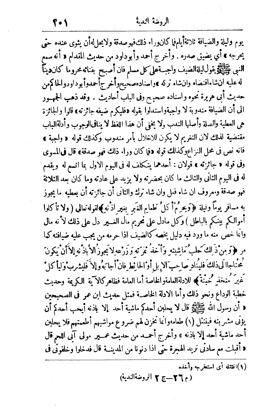 يوم وليلة والضيافة ثلاثة أيام فما كان وراء ذلك فهو صدقة ولا يحل له أن يثوي عنده حتى يُحْرجه" أي يضيق صدره وأخرج أحمد وأبو دادو من حديث المقدام "أنه سمع النبي صلى الله عليه وسلم يقول: "ليلة الضيف واجبة على كل مسلم فإن أصبح بفنائه محروما كان دينا له عليه إن شاء اقتضاه وإن شاء تركه" وإسناده صحيح وأخرج أحمد وأبو داود والحاكم من حديث أبي هريرة نحوه وإسناده صحيح وفي الباب أحاديث وقد ذهب الجمهور إلى أن الضيافة مندوبة لا واجبة واستدلوا بقوله "فليكرمه ضيفه جائزته" قالوا: والجائزة هي العطية والصلة وأصلها الندب ولا يخفى أن هذا اللفظ لا ينافي الوجوب وأدلة الباب مقتضية لذلك لأن التغريم لا يكون للإخلال بأمر مندوب وكذلك قوله "واجبة " فإنه نص في محل النزاع وكذلك قوله "فما كان وراء ذلك فهو صدقة " قال في المسوى: وفي قوله "جائزته" قولان: أحدهما يتكلف له في اليوم الأول بما اتسع له ويقدم له في اليوم الثاني والثالث ما كان بحضرته ولا يزيد على عادته وما كان بعد الثلاثة فهو صدقة ومعروف إن شاء فعل وإن شاء ترك والثاني أن جائزته أن يعطيه ما يجوز به مسافر يوما وليلة "ويَحْرم أكل طعام الغير بغير إذنه"لقوله تعالى {وَلا تَأْكُلُوا أَمْوَالَكُمْ بَيْنَكُمْ بِالْبَاطِلِ} وكل مادل على تحريم مال الغير دل على ذلك لأنه مال وإنما خص منه ما ورد فيه دليل يخصه كالضيف إذا حرمه من يجب عليه ضيافته كما مر "ومن ذلك حلْب ماشيته وأخْذ ثمرته وزرعه لا يجوز إلا بإذنه إلى أن يكون محتاجا إلى ذلك فلْيُناد صاحب الإبل أو الحائط فإن أجابه وإلا فليشرب وليأكل غير متخذ خبنة"للأدلة العامة والخاصة أما العامة فظاهر كالآية الكريمة وحديث خطبة الوداع ونحو ذلك وأما الأدلة الخاصة فمثل: حديث ابن عمر في الصحيحين "أن رسول الله صلى الله عليه وسلم قال: "لا يحلبن أحدكم ماشية أحد إلا بإذنه أيحب أحدكم أن يؤتى مشربته فينتثل1 طعامه وإنما تخزن لهم ضروع مواشيهم أطعمتهم فلا يحلبن أحد ماشية أحد إلا بإذنه " وأخرج أحمد من حديث عمير مولى آبي اللحم قال: "أقبلت مع سادتي نريد الهجرة حتى إذا دنونا من المدينة قال: فدخلوا وخلفوني في