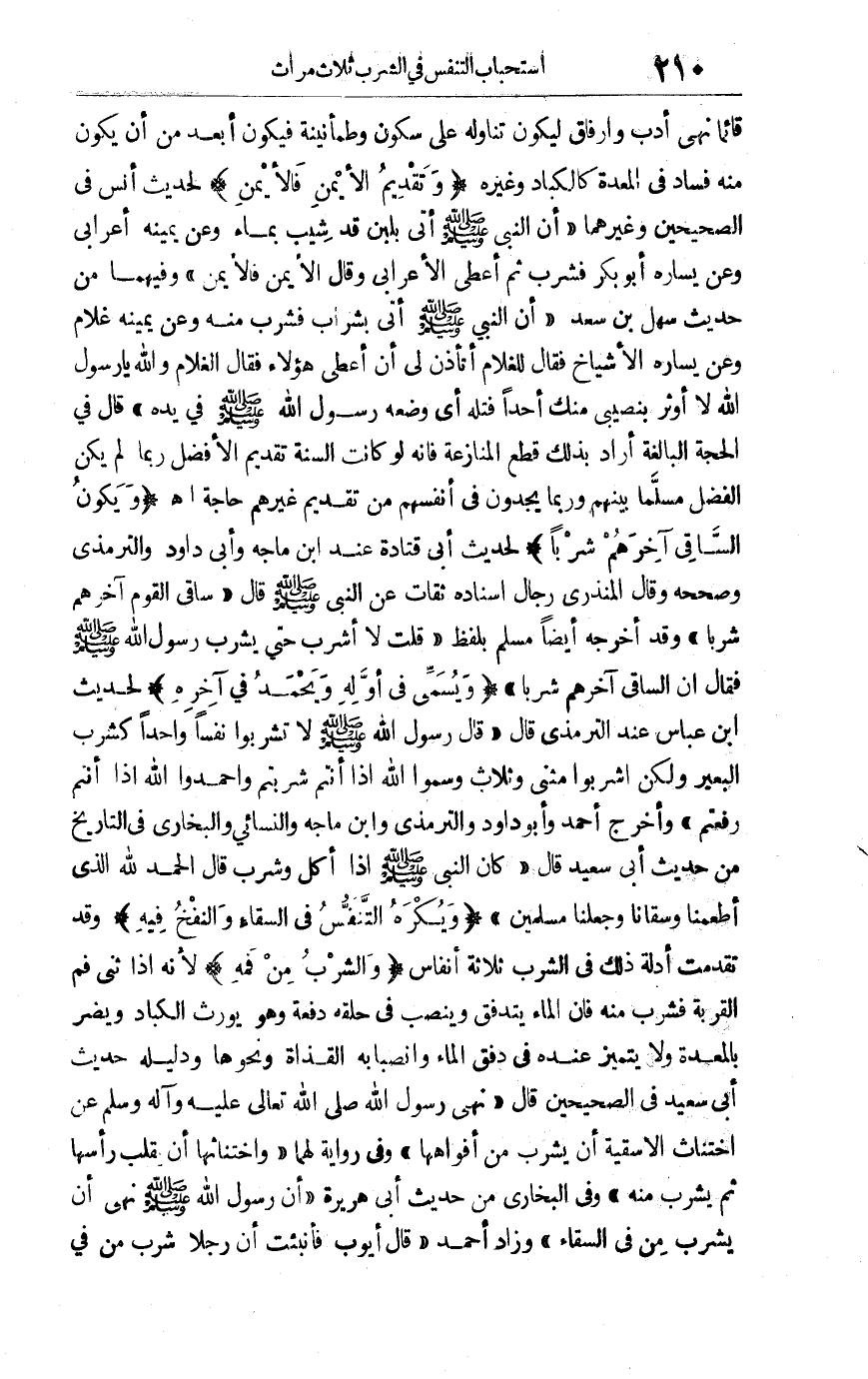 قائما نهي أدب وإرفاق ليكون تناوله على سكون وطمأنينة فيكون أبعد من أن يكون منه فساد في المعدة كالكباد وغيره "وتقديم الأيمن فالأيمن"لحديث أنس في الصحيحين وغيرهما "أن النبي صلى الله عليه وسلم أُتي بلبن قد شيب بماء وعن يمينه أعرابي وعن يساره أبو بكر فشرب ثم أعطى الأعرابي وقال "الأيمن فالأيمن" وفيهما من حديث سهل بن سعد أن النبي صلى الله عليه وسلم أتي بشراب فشرب منه وعن يمينه غلام وعن يساره الأشياخ فقال للغلام "أتأذن لي أن أعطي هؤلاء فقال الغلام: والله يارسول الله لا أوثر بنصيبي منك أحدا فتله أي وضعه رسول الله صلى الله عليه وسلم في يده"قال في الحجة البالغة: أراد بذلك قطع المنازعة فإنه لو كانت السنة تقديم الأفضل ربما لم يكن الفضل مسلّما بينهم وربما يجدون في أنفسهم من تقديم غيرهم حاجة اهـ "ويكون الساقي آخرهم شربا" لحديث أبي قتادة عند ابن ماجه وأبي داود والترمذي وصححه وقال المنذري: رجال إسناده ثقات عن النبي صلى الله عليه وسلم قال: "ساقي القوم آخرهم شربا " وقد أخرجه أيضا مسلم بلفظ"قلت لا أشرب حتى يشرب رسول الله صلى الله عليه وسلم فقال: "إن الساقي آخرهم شُرباً" "ويسمِّي في أوله ويحمد في آخره" لحديث ابن عباس عند الترمذي قال: قال رسول الله صلى الله عليه وسلم: "لا تشربوا نفسا واحدا كشرب البعير ولكن اشربوا مثنى وثلاث وسموا الله إذا أنتم شربتم واحمدوا الله إذا إنتم رفعتم" أخرج أحمد وأبو داود والترمذي وابن ماجه والنسائي والبخاري في التاريخ من حديث أبي سعيد قال: كان النبي صلى الله عليه وسلم إذا أكل وشرب قال: "الحمد لله الذي أطعمنا وسقانا وجعلنا مسلمين" "ويُكره التنفس في السِّقاء والنفخ فيه"وقد تقدمت أدلة ذلك في الشرب ثلاثة أنفاس "والشرب من فمه"لأنه إذا ثنى فم القربة فشرب منه فإن الماء يتدفق وينصب في حقه دفعة وهو يورث الكباد ويضر بالمعدة ولا يتميز عنده في دفق الماء وانصبابه القذاة ونحوها ودليله حديث أبي سعيد في الصحيحين قال: "نهى رسول الله صلى الله تعالى عليه وآله وسلم عن اختناث الأسقية أن يشرب من أفواهها "وفي رواية لهما "واختناثها أن يقلب رأسها ثم يشرب منه "وفي البخاري من حديث أبي هريرة "أن رسول الله صلى الله عليه وسلم نهى أن يشرب منه "وفي البخاري من حديث أبي هريرة "أن رسول الله صلى الله عليه وسلم نهى أن يشرب من في السقاء "وزاد أحمد "قال أيوب فأنبئت أن رجلا شرب من في