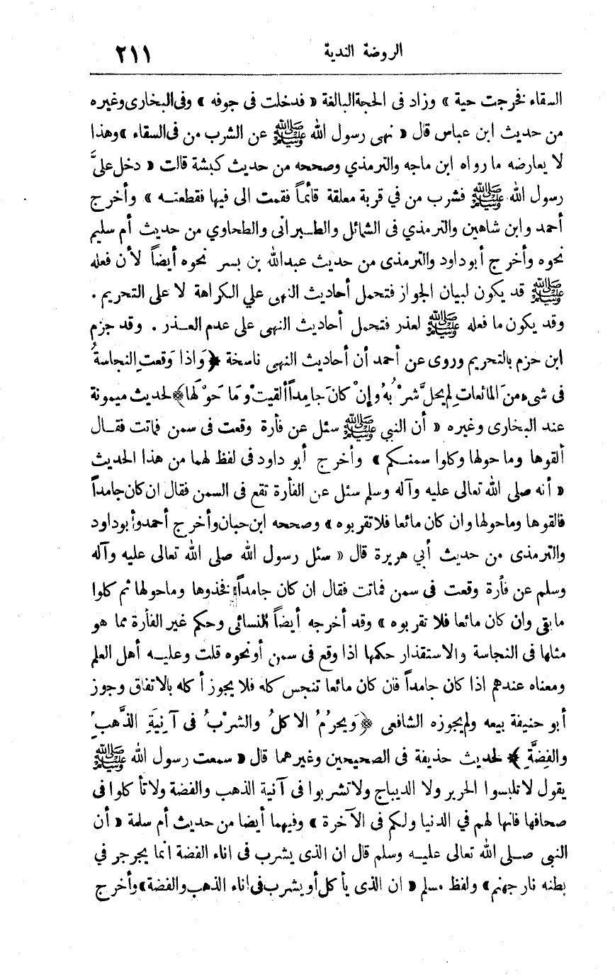 السقاء فخرجت حية "وزاد في الحجة البالغة: "فدخلت في جوفه "وفي البخاري وغيره من حديث ابن عباس قال: "نهى رسول الله صلى الله عليه وسلم عن الشرب من في السقاء "وهذا لا يعارضه مارواه ابن ماجة والترمذي وصححه من حديث كبشة قالت: "دخل علي رسول الله صلى الله عليه وسلم فشرب من في قربة معلقة قائما فقمت إلى فيها فقطعته "وأخرج أحمد وابن شاهين والترمذي في الشمائل والطبراني والطحاوي من حديث أم سليم ونحوه وأخرج أبو داود والترمذي من حديث عبد الله بن بسر نحوه أيضا لأنه فعله صلى الله عليه وسلم قد يكون لبيان الجواز فتحمل أحاديث النهي على الكراهة لا على التحريم وقد يكون ما فعله صلى الله عليه وسلم لعذر فتحمل أحاديث النهي على عدم العذر وقد جزم ابن حزم بالتحريم وروي عن أحمد أن أحاديث النهي ناسخة "وإذا وقعت النجاسة في شئ من المائعات لم يحل شربه وإن كان جامدا أُلقيت وما حولها"لحديث ميمونة عند البخاري وغيره "أن النبي صلى الله عليه وسلم سئل عن فأرة وقعت في سمن فماتت فقال: "لقوها وما حولها وكلوا سمنكم" وأخرج أبو داود في لفظ لهما من هذا الحديث "أنه صلى الله تعالى عليه وآله وسلم سئل عن الفأرة تقع في السمن فقال: إن كان جامدا فألقوها وما حولها وإن كان مائعا فلا تقربوه " وصححه ابن حبان وأخرج أحمد وأبو داود والترمذي من حديث أبي هريرة قال: "سئل رسول الله صلى الله تعالى عليه وآله وسلم عن فأرة وقعت في سمن فماتت فقال: "إن كان جامدا فخذوها وما حولها ثم كلوا ما بقي وإن كان مائعا فلا تقربوه" وقد أخرجه أيضا النسائي وحكم غير الفأرة مما هو مثلها في النجاسة والاستقذار حكمها إذا وقع في سمن أو نحوه قلت: وعليه أهل العلم ومعناه عندهم إذا كان جامدا فإن كان مائعا تنجس كله فلا يجوز أكله بالاتفاق وجوز أبو حنيفة بيعه ولم يجوزه الشافعي "ويحرم الأكل والشرب في آنية الذهب والفضة"لحديث حذيفة في الصحيحين وغيرهما قال "سمعت رسول الله صلى الله عليه وسلم يقول: " لا تلبسوا الحرير ولا الديباج ولا تشربوا في آنية الفضة ولا تأكلوا في صحافها فإنها لهم في الدنيا ولكم في الآخرة" وفيهما أيضا من حديث أم سلمة "أن النبي صلى الله تعالى عليه وسلم قال: "إن الذي يشرب في إناء الفضة إنما يجرجر في بطنه نار جهنم " ولفظ مسلم "إن الذي يأكل أو يشرب في إناء الذهب والفضة" وأخرج