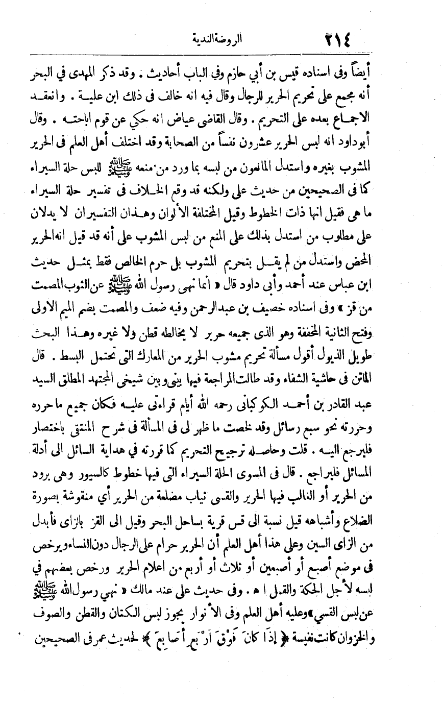 أيضا وفي إسناده قيس بن أبي حازم وفي الباب أحاديث وقد ذكر المهدي في البحر أنه مجمع على تحريم الحرير للرجال وقال فيه إنه خالف في ذلك ابن علية وانعقد الإجماع بعده على التحريم وقال القاضي عياض: إنه حكي عن قوم إباحته وقال أبو داود: إنه لبس الحرير عشرون نفسا من الصحابة وقد اختلف أهل العلم في الحرير المشوب بغيره واستدل المانعون من لبسه بما ورد من منعه صلى الله عليه وسلم للبس حلة السيراء كما في الصحيحين من حديث علي ولكنه قد وقع الخلاف في تفسير حلة السيراء ما هي فقيل إنها ذات الخطوط وقيل المختلفة الألوان وهذان التفسيران لا يدلان على مطلوب من استدل بذلك على المنع من لبس المشوب على أنه قد قيل إنه الحرير المحض واستدل من لم يقل بتحريم المشوب بل حرم الخالص فقط بمثل حديث ابن عباس عند أحمد وأبي داود قال: "إنما نهى رسول الله صلى الله عليه وسلم عن الثوب المصمت من قز "وفي إسناده خصيف بن عبد الرحمن وفيه ضعف والمصمت بضم الميم الأولى وفتح الثانية المخففة وهو الذي جميعه حرير لا يخالطه قطن ولا غيره وهذا البحث طويل الذيول أقول مسألة تحريم مشوب الحرير من المعارك التي تحتمل البسط قال الماتن في حاشية الشفاء: وقد طالت المراجعة فيها بيني وبين شيخي المجتهد المطلق السيد عبد القادر بن أحمد الكوكباني رحمه الله أيام قراءتي عليه فكان جميع ما حرره وحررته نحو سبع رسائل وقد لخصت ما ظهر لي في المسألة في شرح المنتقى باختصار فليرجع إليه قلت: وحاصله ترجيح التحريم كما قررته في هداية السائل إلى أدلة المسائل فليراجع قال في المسوي: الحلة السيراء التي فيها خطوط كالسيور وهي برود من الحرير أو الغالب فيها الحرير والقسي ثياب مضلعة من الحرير أي منقوشة بصورة الضلاع وأشباهه قيل نسبة إلى قس قرية بساحل البحر وقيل إلى القز بالزاي فأبدل من الزاي السين وعلى هذا أهل العلم أن الحرير حرام على الرجال دون النساء ويرخص في موضع إصبع أو إصبعين أو ثلاث أو أربع من أعلام الحرير ورخص بعضهم في لبسه لأجل الحكة والقمل اهـ. وفي حديث علي عند مالك "نهى رسول الله صلى الله عليه وسلم عن لبس القسي "وعليه أهل العلم وفي الأنوار يجوز لبس الكتان والقطن والصوف والخزوان كانت نفيسة "إذا كان فوق أربع أصابع"لحديث عمر في الصحيحين