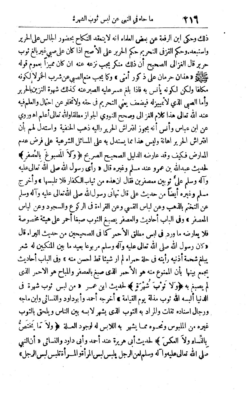 ذلك وحكى ابن الرفعة عن بعض العلماء أنه لا ينعقد النكاح بحضور الجالس على الحرير واستبعد وحكم القز في التحريم حكم الحرير على الأصح إذا كان على صبي غير بالغ ثوب حرير قال الغزالي: الصحيح أن ذلك منكر يجب نزعه عنه إن كان مميزا بعموم قوله صلى الله عليه وسلم: "هذان حرامان على ذكور أمتي" وكما يجب منع الصبي عن شرب الخمر لكونه مكلفا ولكن لكونه يأنس به فإذا بلغ عسر عليه الصبر عنه كذلك شهوة التزين بالحرير وأما الصبي الذي لا تمييز له فيضعف - يعني - التحريم في حقه ولا تخلو عن احتمال والعلم فيه عند الله تعالى هذا كلام الغزالي وصحح النووي الجواز مطلقا والله تعالى أعلم اهـ وروي عن ابن عباس وأنس أنه يجوز افتراش الحرير وإليه ذهب الحنفية واستدل لهم بأن افتراش الحرير إهانة وليس هذا مما يستدل به عى المسائل الشرعية على فرض عدم المعارض فكيف وقد عارضه الدليل الصحيح الصريح "ولا المصبوغ بالعصفر"لحديث عبد الله بن عمرو عند مسلم وغيره قال: "رأى رسول الله صلى الله تعالى عليه وآله وسلم عليّ ثوبين معصفرين فقال "إن هذه من ثياب الكفار فلا تلبسها " وأخرج مسلم وغيره أيضا من حديث علي قال: "نهاني رسول الله صلى الله تعالى عليه وآله وسلم عن التختم بالذهب وعن لباس القسي وعن القراءة في الركوع والسجود وعن لباس المعصفر "وفي الباب أحاديث والعصفر يصبغ الثوب صبغا أحمر على هيئة مخصوصة فلا يعارضه مارود في لبس مطلق الأحمر كما في الصحيحين من حديث البراء قال: "كان رسول الله صلى الله تعالى عليه وآله وسلم مربوعا بعيد ما بين المنكبين له شعر يبلغ شحمة أذنيه رأيته في حلة حمراء لم أر شيئا قط أحسن منه "وفي الباب أحاديث يجمع بينهما بأن الممنوع منه هو الأحمر الذي صبغ بالعصفر والمباح هو الأحمر الذي لم يصبغ به "ولا ثوب شهرة"لحديث ابن عمر "من لبس ثوب شهرة في الدنيا ألبسه الله ثوب مذلة يوم القيامة" أخرجه أحمد وأبو داود والنسائي وابن ماجه ورجال إسناده ثقات والمراد به الثوب الذي يشهر لابسه بين الناس ويلحق بالثوب غيره من الملبوس ونحوه مما يشهر به اللابس له لوجود العلة "ولا ما يختص بالنساء ولا العكس"لحديث أبي هريرة عند أحمد وأبي داود والنسائي "أن النبي صلى الله تعالى عليه وآله وسلم لعن الرجل يلبس لبس المرأة والمرأة تلبس لبس الرجل "