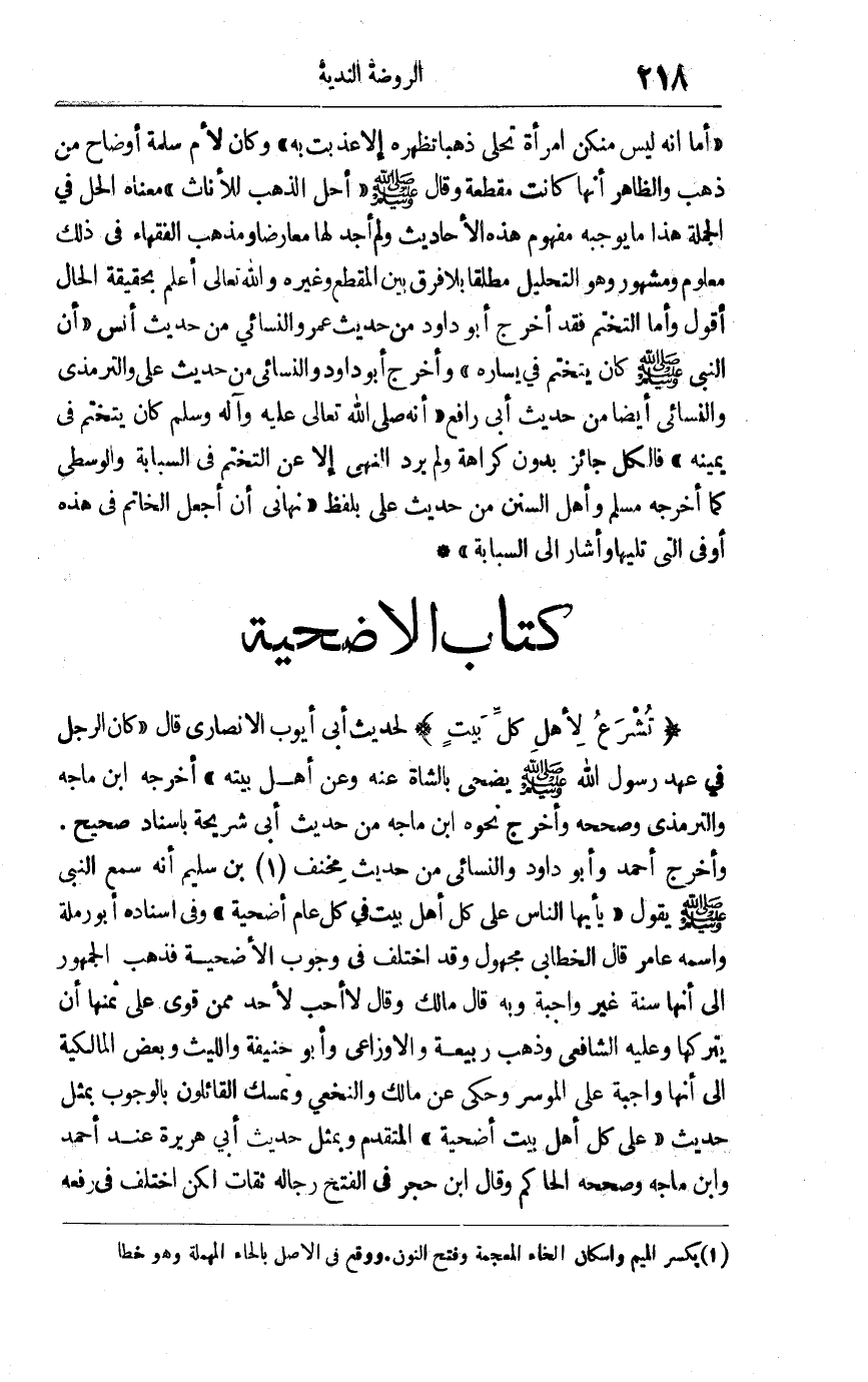 "تُشرع لأهل كل بيت" لحديث أبي أيوب الأنصاري قال: "كان الرجل في عهد رسول الله صلى الله عليه وسلم يضحي بالشاة عنه وعن أهل بيته" أخرجه ابن ماجه والترمذي وصححه وأخرج نحو ابن ماجه من حديث أبي شريحة بإسناد صحيح وأخرج أحمد وأبو داود والنسائي من حديث مخنف1 بن سليم أنه سمع النبي صلى الله عليه وسلم يقول: "ياأيها الناس على كل أهل بيت في كل عام أضحية" وفي إسناده أبو رملة واسمه عامر قال الخطابي مجهول وقد اختلف في وجوب الأضحية فذهب الجمهور إلى أنها سنة غير واجبة وبه قال مالك وقال: لا أحب لأحد ممن قوي على ثمنها أن يتكرها وعليه الشافعي وذهب ربيعة والأوزاعي وأبو حنيفة والليث وبعض المالكية إلى أنها واجبة على الموسر وحكي عن مالك والنخمي وتمسك القائلون بالوجوب بمثل حديث "على كل أهل بيت أضحية " المتقدم وبمثل حديث أبي هريرة عند أحمد وابن ماجه وصححه الحاكم وقال ابن حجر في الفتح رجاله ثقات لكن اختلف في رفعه