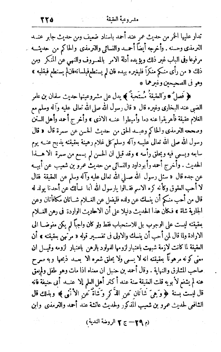 "فصل والعقيقة مستحبة" يدل على مشروعيتها حديث سلمان بن عامر الضبي عند البخاري وغيره قال: قال رسول الله صلى الله تعالى عليه وآله وسلم: "مع الغلام عقيقة فأهريقوا عنه دما وأميطوا عنه الأذى" وأخرج أحمد وأهل السنن وصححه الترمذي والحاكم وعبد الحق من حديث الحسن عن سمرة قال: قال رسول الله صلى الله تعالى عليه وآله وسلم: "كل غلام رهينة بعقيقته يذبح عنه يوم سابعه ويسمى فيه ويحلق رأسه" وقد قيل إن الحسن لم يسمع من سمرة إلا هذا الحديث وأخرج أحمد وأبو داود والنسائي من حديث عمرو بن شعيب عن أبيه عن جده قال: "سئل رسول الله صلى الله تعالى عليه وآله وسلم عن العقيقة فقال: "لا أحب العقوق" وكأنه كره الاسم فقالوا يا رسول الله: إنما نسألك عن أحدنا يولد له قال: من أحب منكم أن ينسك عن ولده فليفعل عن الغلام شاتان مكافأتان وعن الجارية شاة فكان هذا الحديث دليلا على أن الأحاديث الواردة في رهن الغلام بعقيقته ليست على الوجوب بل للاستحباب فقط ولو كان واجبا لم يكن مفوضا إلى الإرادة ولما قال لمن أحب أن ينسك والأولى في تفسير قوله "مرتهن بعتيقته" أن العقيقة لما كانت لازمة شبهت باعتبار لزومها للمولود بالرهن باعتبار لزومه وقيل: إن معنى كونه مرهونا بعقيقته أنه لا يسمى ولا يحلق شعره إلا بعد ذبحها وبه صرح صابح المشارق والنهاية وقال أحمد بن حنبل: إن معناه إذا مات وهو طفل ولم يعق عنه لم يشفع لأبويه قلت: العقيقة سنة عند أكثر أهل العلم إلا عند أبي حنيفة فإنه قال ليست بسنة "وهي شاتان عن الذكر وشاة عن الأنثى" وبذلك قال الشافعي لحديث عمرو بن شعيب المذكور ولحديث عائشة عند أحمد والترمذي وابن