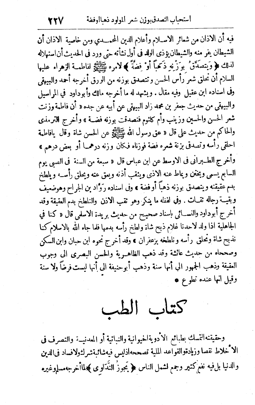 فيه أن الأذان من شعائر الإسلام وأعلام الدين المحمدي ومن خاصية الأذان أن الشيطان يفر منه الشيطان يؤذي الولد في أول نشأته حتى ورد في الحديث أن استهلاله لذلك "ويُتصدق بوزنه ذهبا أو فضة" لأمره صلى الله عليه وسلم لفاطمة الزهراء عليها السلام أن تحلق شعر رأس الحسن وتتصدق بوزنه من الورق أخرجه أحمد والبيقهي وفي إسناده ابن عقيل وفيه مقال ويشهد له ما أخرجه مالك وأبو داود في المراسيل والبيهقي من حديث جعفر ابن محمد زاد البيهقي عن أبيه عن جده "أن فاطمة وزنت شعر الحسن والحسين وزينب وأم كلثوم فتصدقت بوزنه فضة "وأخرج الترمذي والحاكم من حديث علي قال: "عق رسول الله صلى الله عليه وسلم عن الحسن شاة وقال: "يا فاطمة احلقي رأسه وتصدقي بزنة شعره فضة" فوزناه فكان وزنه درهما أوبعض درهم" وأخرج الطبراني في الأوسط عن ابن عباس قال: "سبعة من السنة في الصبي يوم السابع يسمى ويختن ويماط عنه الأذى ويثقب أذنه ويعق عنه ويحلق رأسه ويلطخ بدم عقيقته ويُتصدق بوزنه ذهبا أو فضة"وفي إسناده رواد بن الجراح وهو ضعيف وبقية رجاله ثقات وفي لفظه ما ينكر وهو ثقب الأذن والتلطخ بدم العقيقة وقد أخرج أبو داود والنسائي بإسناد صحيح من حديث بريدة الأسلمي قال: كنا في الجاهلية إذا ولد لأحدنا غلام ذبح شاة ولطخ رأسه بدمها فلما جاء الله بالإسلام كنا نذبح شاة ونحلق رأسه ونلطخه بزعفران. وقد أخرج نحوه ابن حبان وابن السكن وصححاه من حديث عائشة وقد ذهب الظاهرية والحسن البصري إلى وجوب العقيقة وذهب الجمهور إلى أنها سنة وذهب أبو حنيفة إلى أنها ليست فرضا ولا سنة وقيل إنها عنده تطوع