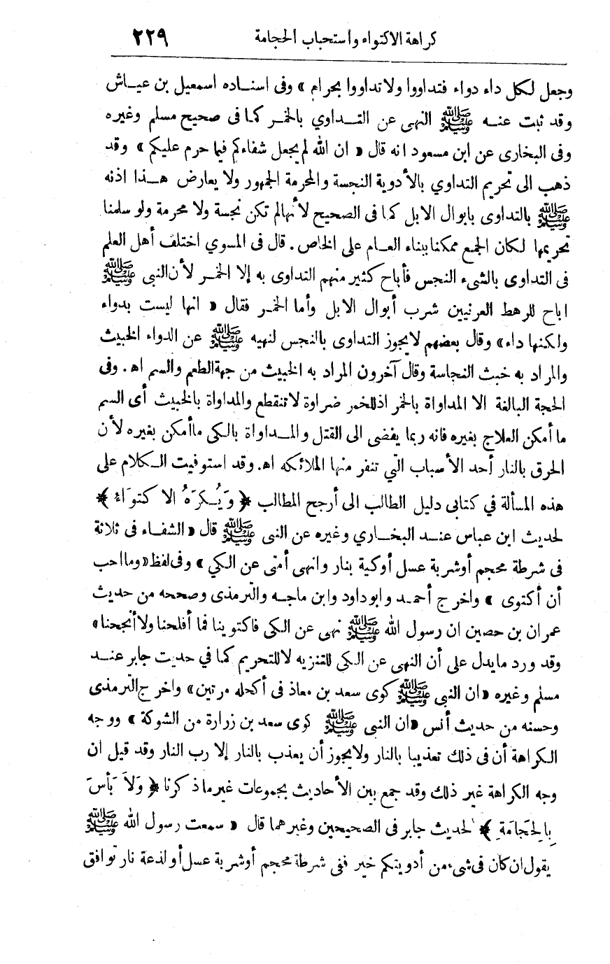 وجعل لكل داء دواء فتداووا ولا تداووا بحرام" وفي إسناده إسمعيل بن عياش وقد ثبت عنه صلى الله عليه وسلم النهي عن التداوي بالخمر كما في صحيح مسلم وغيره وفي البخاري عن ابن مسعود أنه قال: "إن الله لم يجعل شفاءكم فيما حرم عليكم" وقد ذهب إلى تحريم التداوي بالأدوية النجسة والمحرمة الجمهور ولا يعارض هذا إذنه صلى الله عليه وسلم بالتداوي بأبوال الإبل كما في الصحيح لأنها لم تكن نجسة ولا محرمة ولو سلمنا تحريمها لكان الجمع ممكنا ببناء العام على الخاص قال في المسوى: اختلف أهل العلم في التداوي بالشئ النجس فأباح كثير منهم التداوي به إلا الخمر لأن النبي صلى الله عليه وسلم أباح للرهط العرنيين شرب أبوال الإبل وأما الخمر فقال: "إنها ليست بدواء ولكنها داء" وقال بعضهم: لا يجوز التداوي بالنجس لنهيه صلى الله عليه وسلم عن الدواء الخبيث والمراد به خبث النجاسة وقال آخرون المراد به الخبيث من جهة الطعم اهـ وفي الحجة البالغة: إلا المداواة بالخمر إذ للخمر ضراوة لاتنقطع والمداواة بالخبيث أي السم ما أمكن العلاج بغيره فإنه ربما يفضي إلى القتل والمداواة بالكي ما أمكن بغيره لأن الحرق بالنار أحد الأسباب التي تنفر منها الملائكة اهـ وقد استوفيت الكلام على هذه المسألة في كتابي دليل الطالب أرحج المطالب "ويكره الاكتواء" لحديث ابن عباس عند البخاري وغيره عن النبي صلى الله عليه وسلم قال: "الشفاء في ثلاثة في شرطة محجم أو شربة عسل أو كية بنار وأنهى أمتي عن الكي" وفي لفظ "وما أحب أن أكتوي" وأخرج أحمد وأبو داود وابن ماجة الترمذي وصححه من حديث عمران بن حصين أن رسول الله صلى الله عليه وسلم نهى عن الكي فاكتوينا فما أفلحنا ولا أنجحنا وقد ورد ما يدل على أن النهي عن الكي للتنزيه لا للتحريم كما في حديث جابر عند مسلم وغيره "أن النبي صلى الله عليه وسلم كوى سعد بن معاذ في أكحله مرتين" وأخرج الترمذي وحسنه من حديث أنس "أن النبي صلى الله عليه وسلم كوى سعد بن زرارة من الشوكة"ووجه الكراهة أن في ذلك تعذيبا بالنار ولا يجوز أن يعذب بالنار إلا رب النار وقد قيل إن وجه الكراهة غير ذلك وقد جمع بين الأحاديث بمجموعات غير ما ذكرنا "ولا بأس بالحجامة" لحديث جابر في الصحيحين وغيرهما قال: سمعت رسول الله صلى الله عليه وسلم يقول: "إن كان في شئ من أدويتكم خير ففي شرطة محجم أو شربة عسل أو لذعة نار توافق