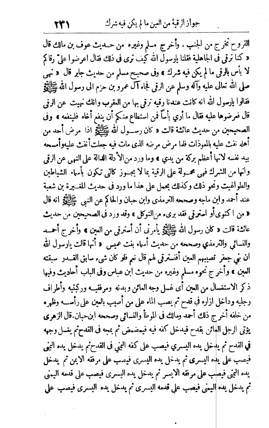 القروح تخرج من الجنب وأخرج مسلم وغيره من حديث عوف بن مالك قال: "كنا نرقي في الجاهلية فقلنا يارسول الله كيف ترى في ذلك فقال: اعرضوا علي رقاكم لا بأس بالرقى ما لم يكن فيه شرك" وفي صحيح مسلم من حديث جابر قال: "نهى صلى الله تعالى عليه وآله وسلم عن الرقى" فجاء آل عمرو بن حزم إلى رسول الله صلى الله عليه وسلم فقالوا يارسول الله: إنه كانت عندنا رقية نرقي بها من العقرب وإنك نهيت عن الرقى قال: فعرضوها عليه فقال: "ما أرى بأسا فمن استطاع منكم أن ينفع أخاه فلينفعه" وفي الصحيحين من حديث عائشة قالت: "كان رسول الله صلى الله عليه وسلم إذا مرض أحد من أهله نفث عليه بالمعوذات فلما مرض مرضه الذي مات فيه جعلت أنفث عليه وأمسحه بيد نفسه لأنها أعظم بركة من يدي" وما ورد من الأدلة الدالة على النهي عن الرقى وأنها من الشرك فهي محمولة على الرقية بما لا يجوز كالتي تكون بأسماء الشياطين والطواغيث ونحو ذلك وكذلك يحمل على هذا ما ورد في حديث المغيرة بن شعبة عند أحمد وابن ماجه وصححه الترمذي وابن حبان والحاكم عن النبي صلى الله عليه وسلم أنه قال: "من اكتوى أو استرقى فقد برىء من التوكل" وقد ورد في الصحيحين من حديث عائشة قالت: "كان رسول الله صلى الله عليه وسلم يأمرني أن أسترقي من العين" وأخرج أحمد والنسائي والترمذي وصححه من حديث أسماء بنت عميس" أنها قالت: يا رسول الله إن بني جعفر تصيبهم العين أفنسترقي لهم؟ قال: "نعم فلو كان شئ سابق القدر سبقته العين" وأخرج نحوه مسلم وغيره من حديث ابن عباس وفي الباب أحاديث وفيها ذكر إستغسال من العين أي غسل وجه العائن وبدنه ومرفقيه وركبتيه وأطراف رجليه وداخل إزاره في قدح ثم يصب الماء على من أصيب بالعين على رأسه وظهره من خلفه أخرج ذلك أحمد ومالك في الموطأ والنسائي وصححه ابن حبان قال الزهري: يؤتى الرجل العائن بقدح فيدخل كفه فيه فيمضمض ثم يمجه في القدح ثم يغسل وجهه في القدح ثم يدخل يده اليسرى فيصب على كفه اليمنى في القدح ثم يدخل يده اليمنى فيصب على يده اليسرى ثم يدخل اليسرى فيصب على مرفقه الأيمن ثم يدخل يده اليمنى فيصب على مرفقه الأيسر ثم يدخل يده اليسرى فيصب على قدمه اليمنى ثم يدخل يده اليمنى فيصب على قدمه اليسرى ثم يدخل يده اليسرى فيصب على