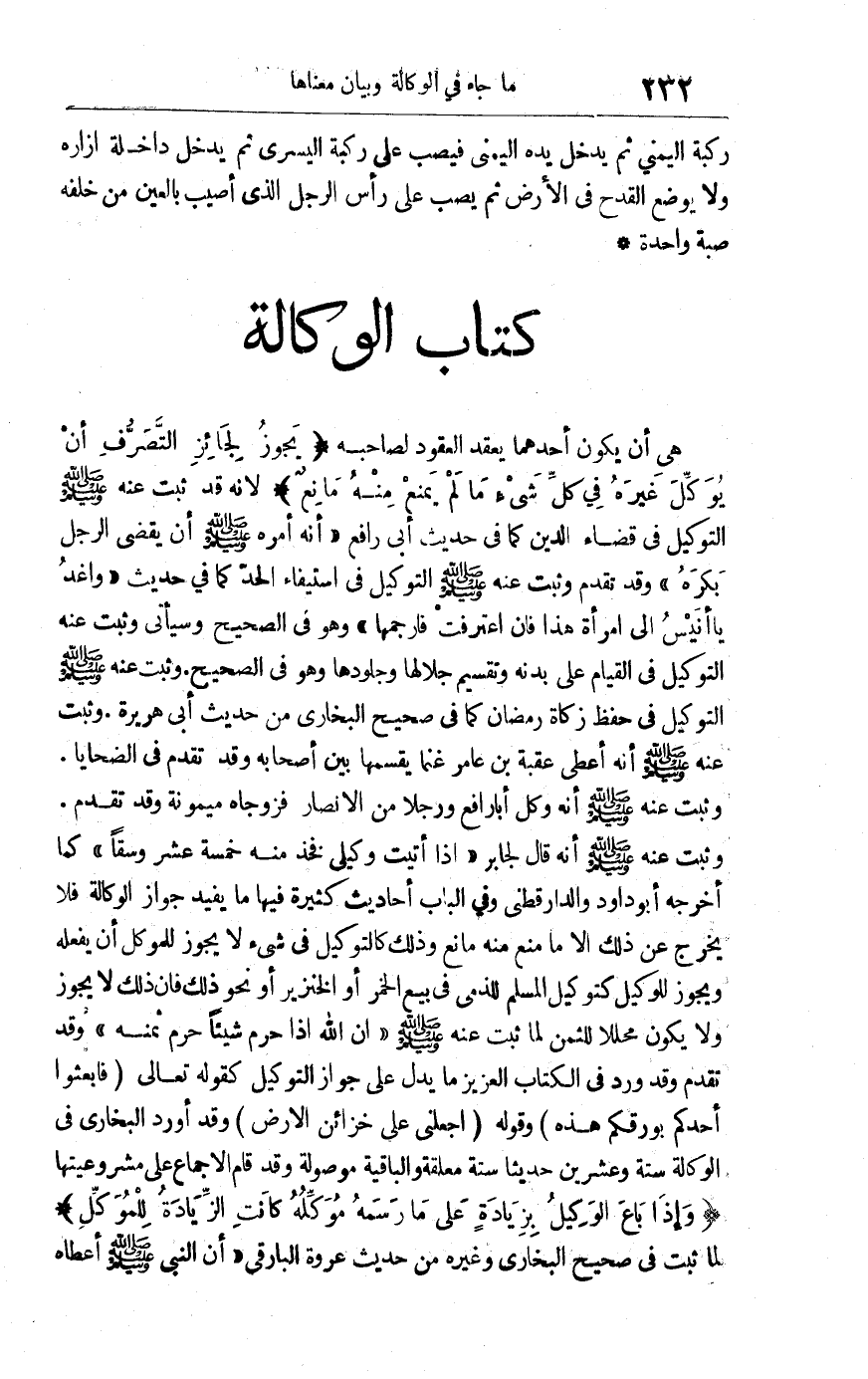هي أن يكون أحدهما يعقد العقود لصاحبه "يجوز لجائز التصرف أن يُوكَّل غيره في كل شئ مالم يمنع منه مانع" لأنه قد ثبت عنه صلى الله عليه وسلم التوكيل في قضاء الدين كما في حديث أبي رافع" أنه أمره صلى الله عليه وسلم أن يقضي الرجل بكره" وقد تقدم وثبت عنه صلى الله عليه وسلم التوكيل في استيفاء الحد كما في حديث" واغد يا أنيس إلى امرأة هذا فإن اعترفت فارجمها" وهو في الصحيح وسيأتي وثبت عنه التوكيل في القيام على بدنة وتقسيم جلالها وجلودها وهو في الصحيح وثبت عنه صلى الله عليه وسلم التوكيل في حفظ زكاة رمضان كما في صحيح البخاري من حديث أبي هريرة وثبت عنه صلى الله عليه وسلم "أنه أعطى عقبة بن عامر غنما يقسمها بين أصحابه" وقد تقدم في الضحايا وثبت عنه صلى الله عليه وسلم "أنه وكل أبا رافع ورجلا من الأنصار فزوجاه ميمونة" وقد تقدم وثبت عنه صلى الله عليه وسلم أنه قال لجابر: "إذا أتيت وكيلي فخذ منه خمسة عشر وسقا" كما أخرجه أبو داود والدارقطني وفي الباب أحاديث كثيرة فيها ما يفيد جواز الوكالة فلا يخرج عن ذلك إلا ما منع منه مانع وذلك كالتوكيل في شئ لا يجوز للموكل أن يفعله ويجوز للوكيل كتوكيل المسلم للذمي في بيع الخمر أو الخنزير أو نحو ذلك فإن ذلك لا يجوز ولا يكون محللا للثمن لما ثبت عنه صلى الله عليه وسلم "إ ن الله إذا حرم شيئا حرم ثمنه" وقد تقدم وقد ورد في الكتاب العزيز ما يدل على جواز التوكيل كقوله تعالى {فَابْعَثُوا أَحَدَكُمْ بِوَرِقِكُمْ هَذِهِ} وقوله {اجْعَلْنِي عَلَى خَزَائِنِ الْأَرْضِ} وقد أورد البخاري في الوكالة ستة وعشرين حديثا ستة معلقة والباقية موصولة وقد قام الإجماع على مشروعيتها "وإذا باع الوكيل بزيادة على ما رسمه موكِّله كانت الزيادة للموكل" لما ثبت في صحيح البخاري وغيره من حديث عروة البارقي "أن النبي صلى الله عليه وسلم أعطاه