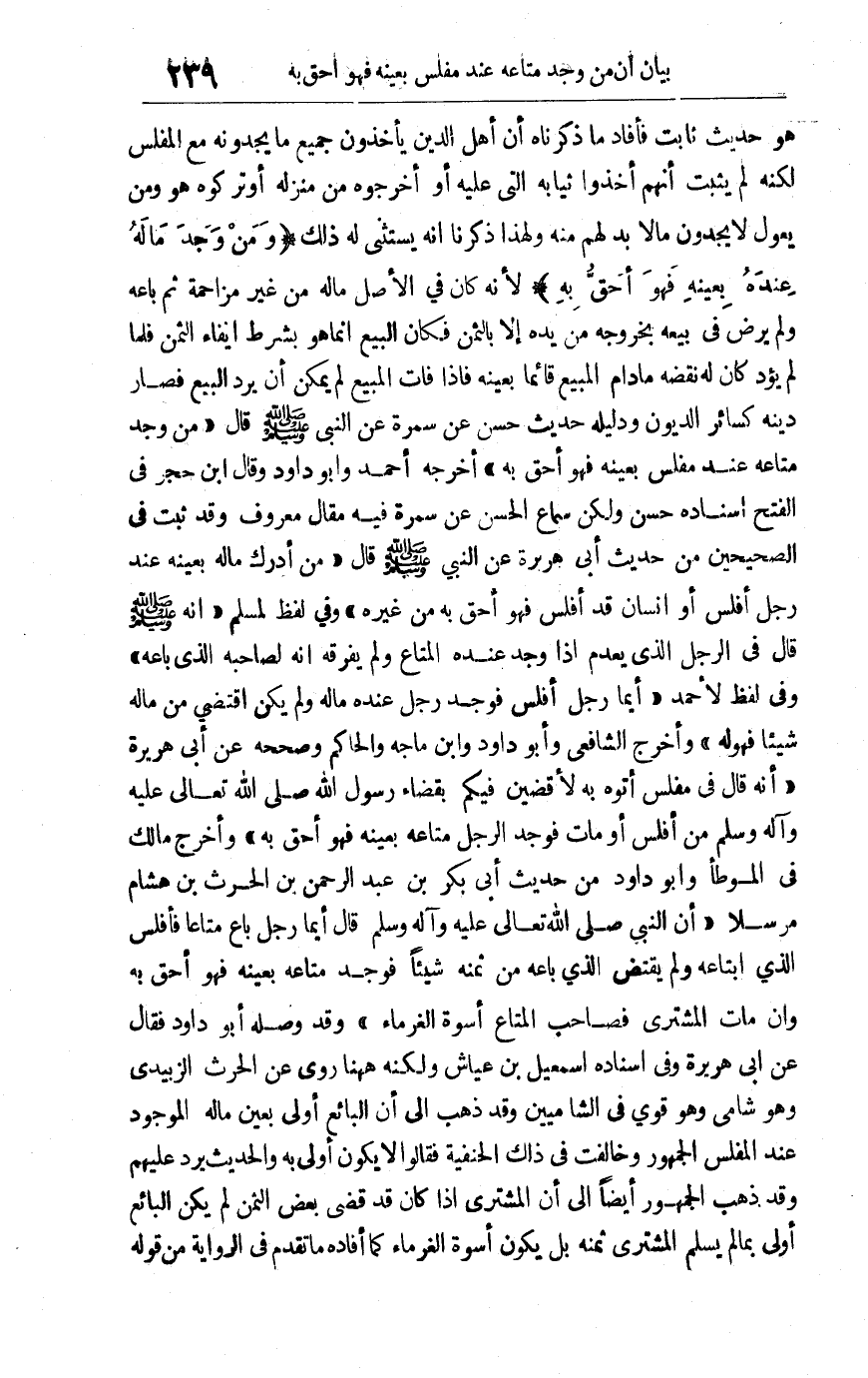 هو حديث ثابت فأفاد ما ذكرناه أن أهل الدين يأخذون جميع ما يجدونه مع المفلس لكنه لم يثبت أنهم أخذوا ثيابه التي عليه أو أخرجوه من منزله أو تركوه هو ومن يعول لا يجدون ما لا بد لهم منه ولهذا ذكرنا أنه يستثنى له ذلك "ومن وجد ماله عنده بعينه فهو أحق به" لأنه كان في الأصل ماله من غير مزاحمة ثم باعه ولم يرض في بيعه بخروجه من يده إلا بالثمن فكان البيع إنما هو بشرط إيفاء الثمن فلما لم يؤد كان له نقضه ما دام المبيع قائما بعينه فإذا فات المبيع لم يمكن أن يرد البيع فصار دينه كسائر الديون ودليله حديث حسن عن سمرة عن النبي صلى الله عليه وسلم قال: "من وجد متاعه عند مفلس بعينه فهو أحق به" أخرجه أحمد وأبو داود وقال ابن حجر في الفتح: إسناده حسن ولكن سماع الحسن عن سمرة فيه مقال معروف وقد ثبت في الصحيحين من حديث أبي هريرة عن النبي صلى الله عليه وسلم قال: "من أدرك ماله بعينه عند رجل أفلس أو إنسان قد أفلس فهو أحق به من غيره" وفي لفظ لمسلم أنه صلى الله عليه وسلم قال في الرجل الذي يعدم: "إذا وجد عنده المتاع ولم يفرقه أنه لصاحبه الذي باعه" وفي لفظ لأحمد "أيما رجل أفلس فوجد رجل عنده ماله ولم يكن اقتضى من ماله شيئا فهو له" وأخرج الشافعي وأبو داود وابن ماجه والحاكم وصححه عن أبي هريرة أنه قال في مفلس أتوه به: لأقضين فيكم بقضاء رسول الله صلى الله تعالى عليه وآله وسلم من أفلس أو مات فوجد الرجل متاعه بعينه فهو أحق به وأخرج مالك في الموطأ وأبو داود من حديث أبي بكر بن عبد الرحمن بن الحرث بن هشام مرسلا أن النبي صلى الله تعالى عليه وآله وسلم قال: " أيما رجل باع متاعا فأفلس الذي ابتاعه ولم يقتض الذي باعه من ثمنه شيئا فوجد متاعه بعينه فهو أحق به وإن مات المشتري فصاحب المتاع أسوة الغرماء" وقد وصله أبو داود فقال عن أبي هريرة وفي إسناده إسمعيل بن عياش ولكنه ههنا روى عن الحرث الزبيدي وهو شامي وهو قوي في الشاميين وقد ذهب إلى أن البائع أولى بعين ماله الموجود عند المفلس الجمهور وخالفت في ذلك الحنفية فقالوا: لا يكون أولى به والحديث يرد عليهم وقد ذهب الجمهور أيضا إلى أن المشتري إذا كان قد قضى بعض الثمن لم يكن البائع أولى بما لم يسلم المشتري ثمنه بل يكون أسوة الغرماء كما أفاده ما تقدم في الرواية من قوله: